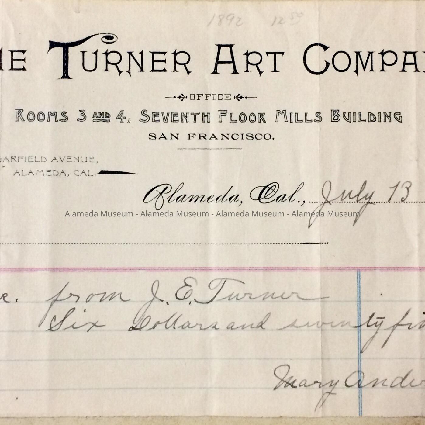 History of Object: Receipt of $6.25 from J. E. Turner to Mary Anderson (possibly an artist?). The receipt caption states "The Turner Art Company, Office Room 3 & 4, Mills Building, S.F." An interesting aspect of the receipt is the fact that their "art rooms" (possibly where the actual art, of an unknown medium, was done) were located on Garfield Avenue, a street recently developed.