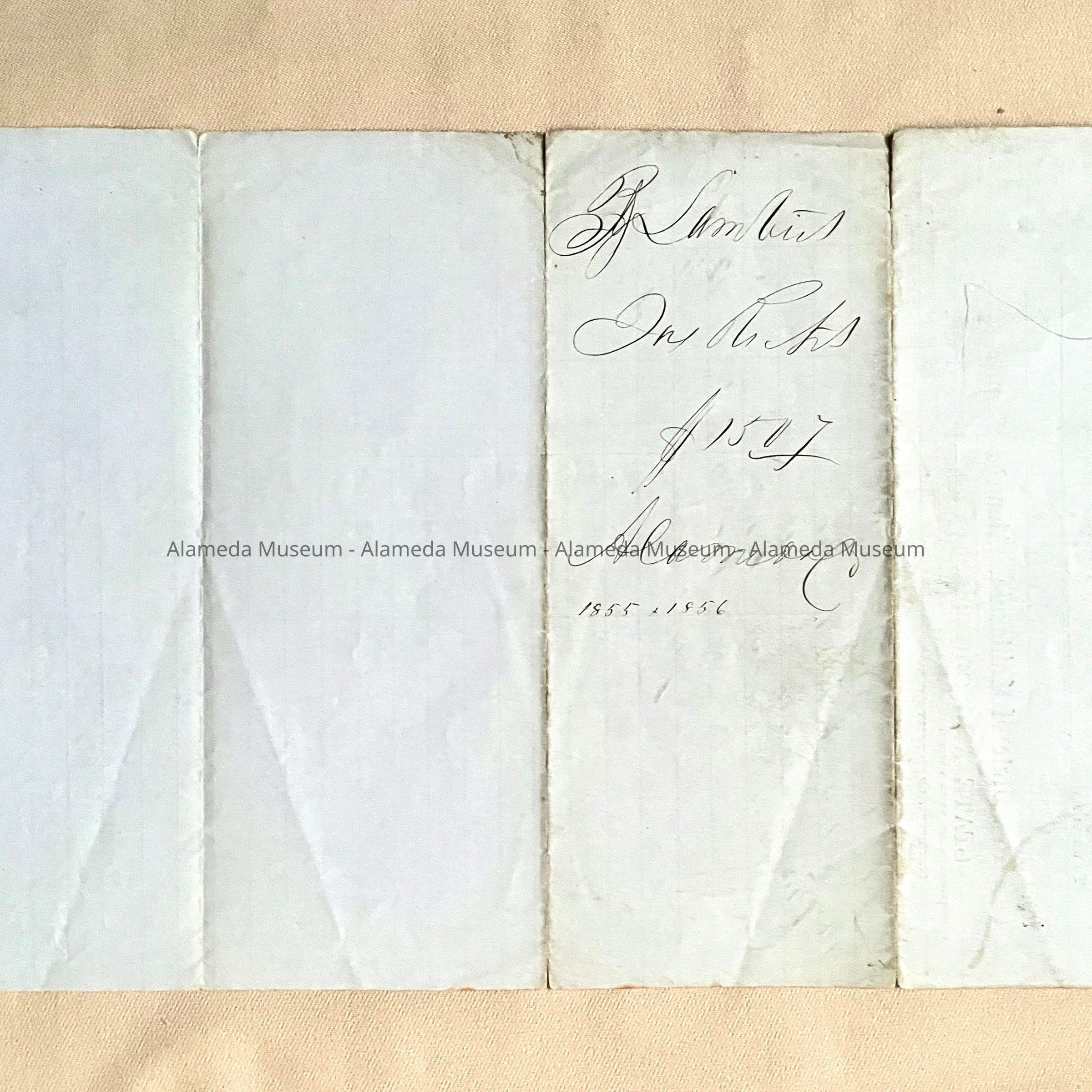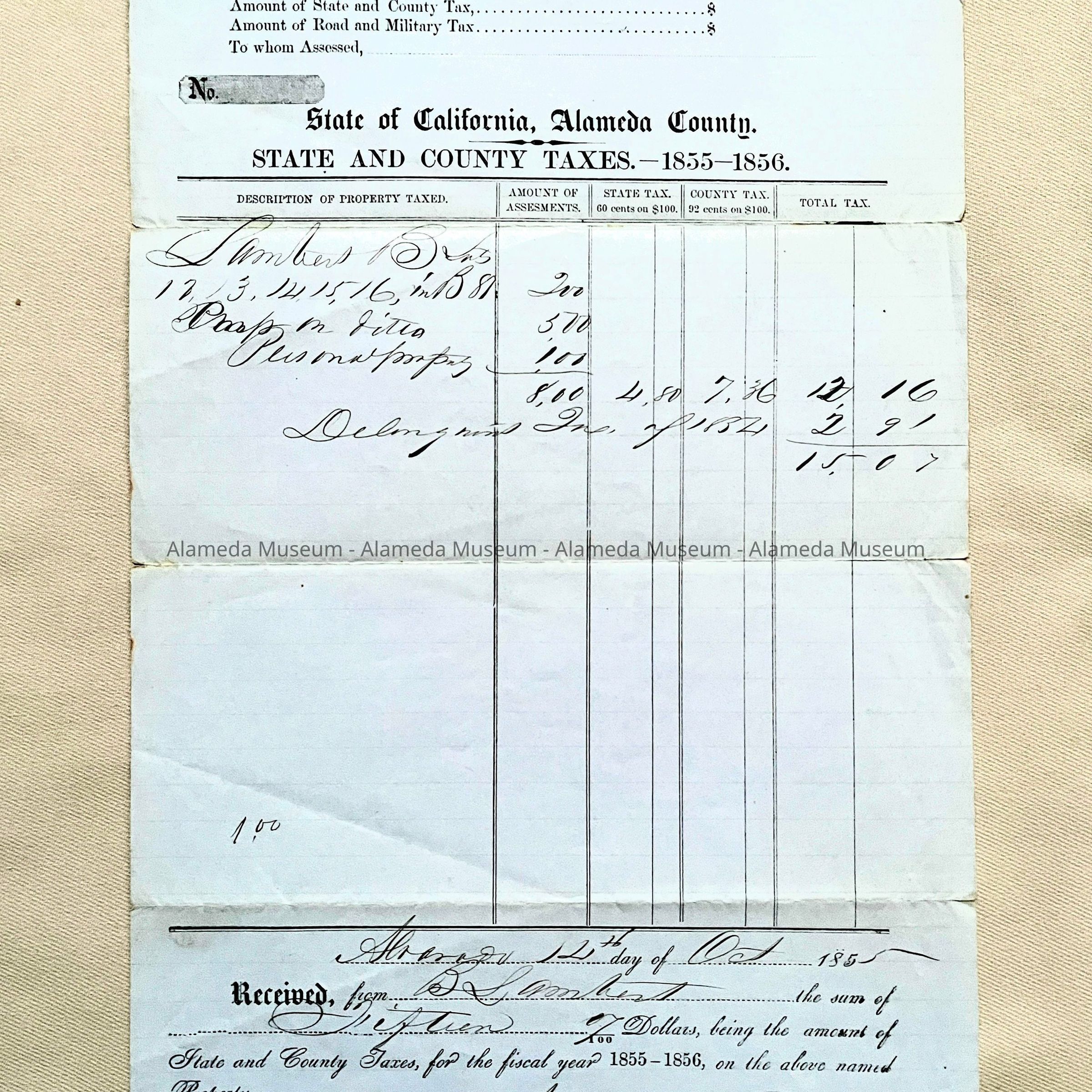 History: Receipt of payment received from B. Lambert for payment of State and County taxes for property located on the east side of Fountain Street between Encinal Avenue and Jackson Street.Object donated in 1959 and never catalogued.