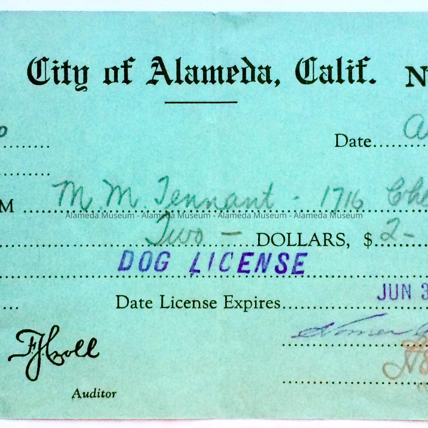 History of Object: Receipt for payment for dog license, M, M. Tennant, 1716 Chestnut St., Alameda, dated Aug 19, 1941.