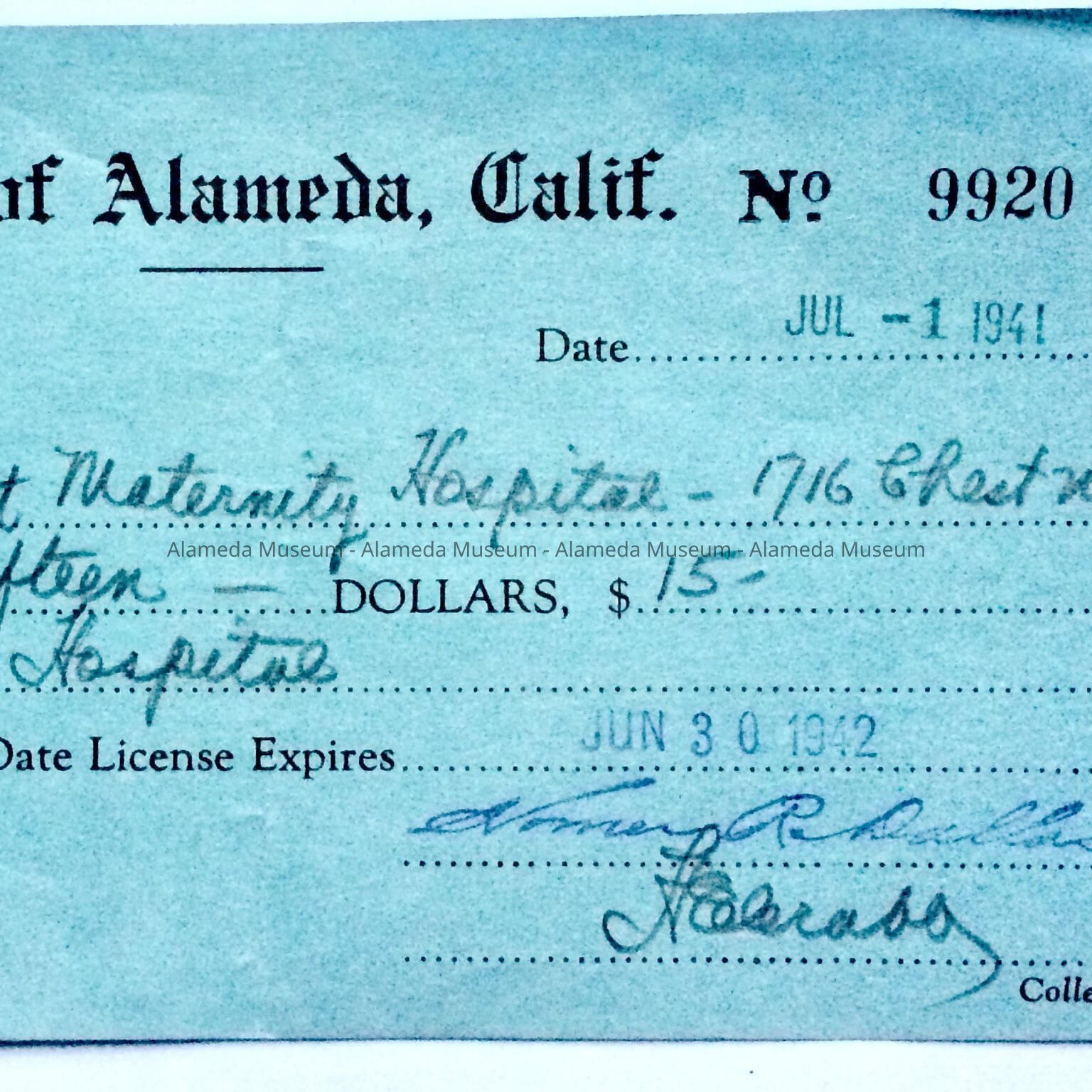 History of Object: Receipt for payment for permit, Tennant Maternity Hospital, 1716 Chestnut St., Alameda, July 1, 1941.