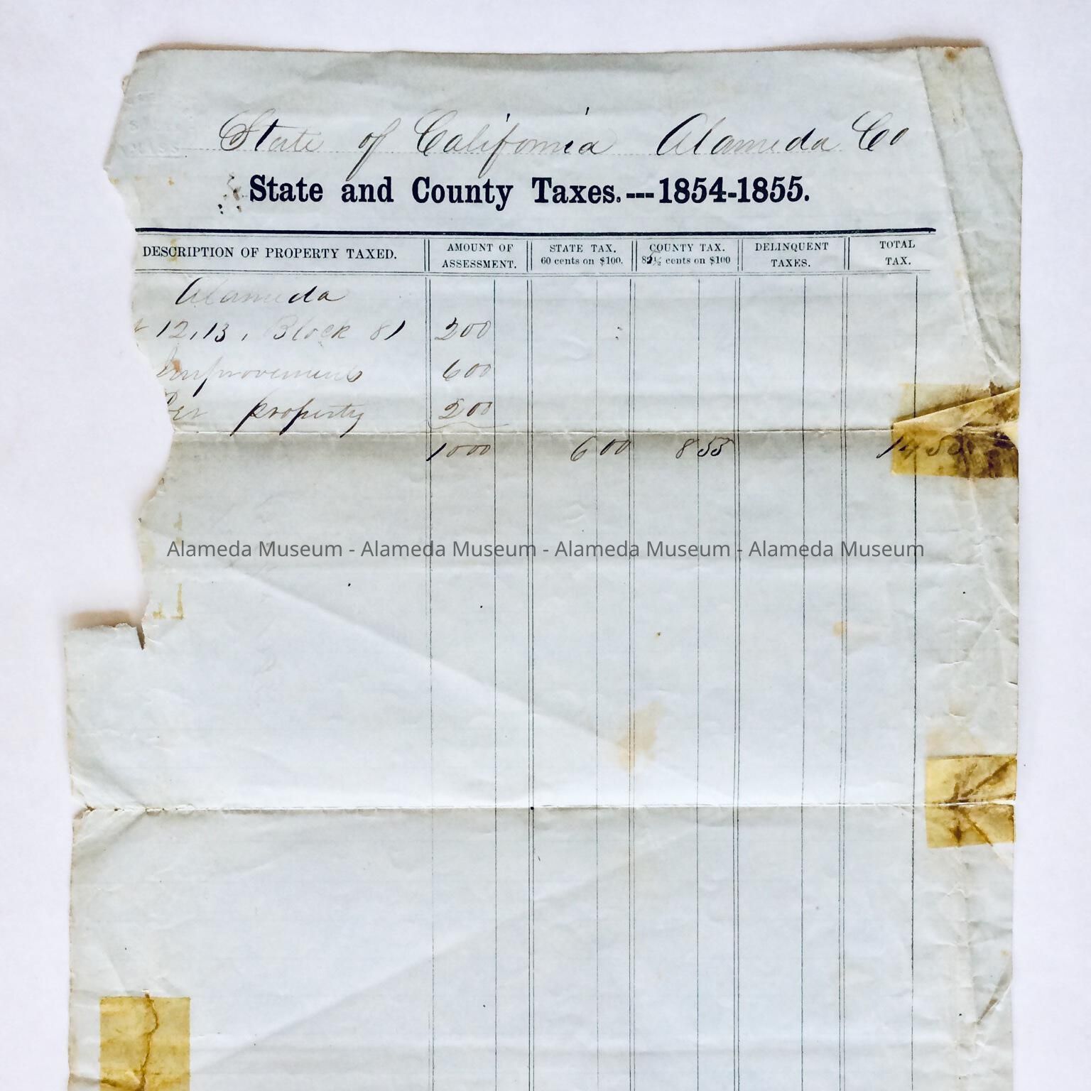 County taxes for property located at the northeast corner of Fountain and Encinal Avenues. The object was given in 1959 to the Alameda Historical Society and never catalogued.