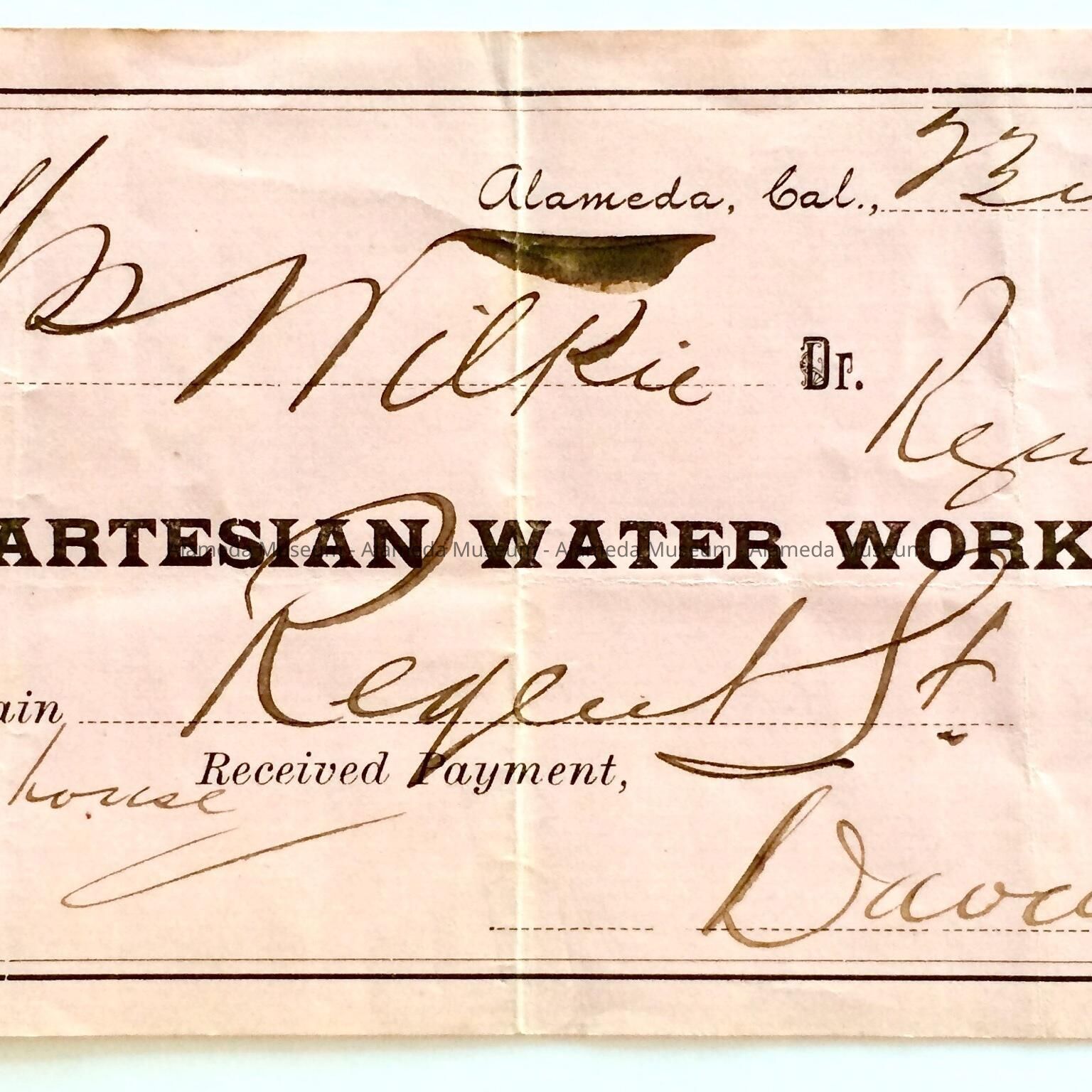 History of Object: Receipt of payment, Artesian Water Works, Alameda, Cal, for May 23rd, 1892, made out to Mrs. Wilkie, Regent Street, for $10.00.