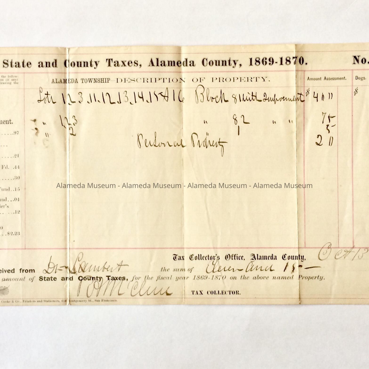 Receipt payment of taxes for property at Encinal and High, 1869-1870Entry/Object ID
