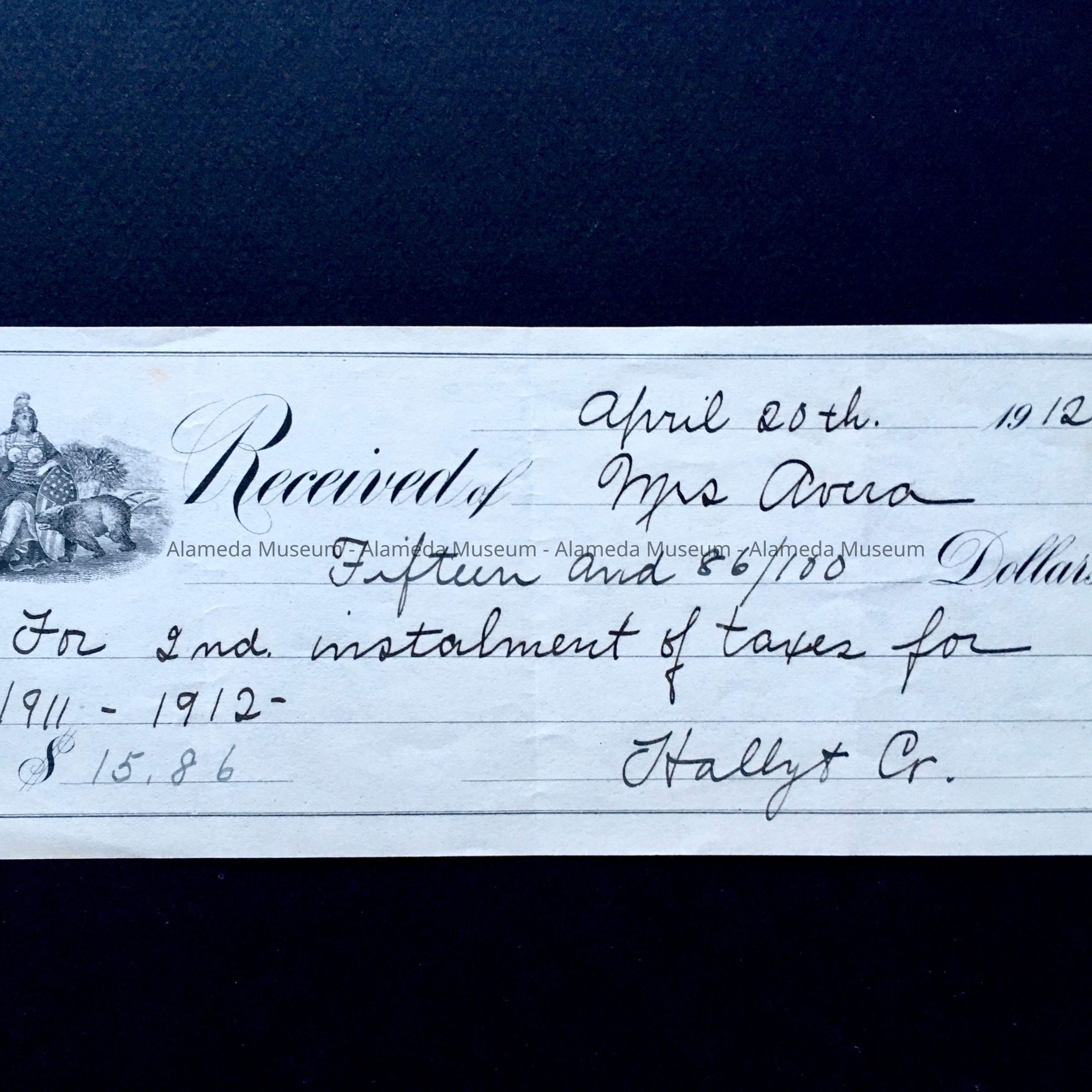 History of Object: Receipt for payment of taxes (property) from Hally & Co., made out to Mrs. Avera (3261 Garfield Avenue), dated 1912.