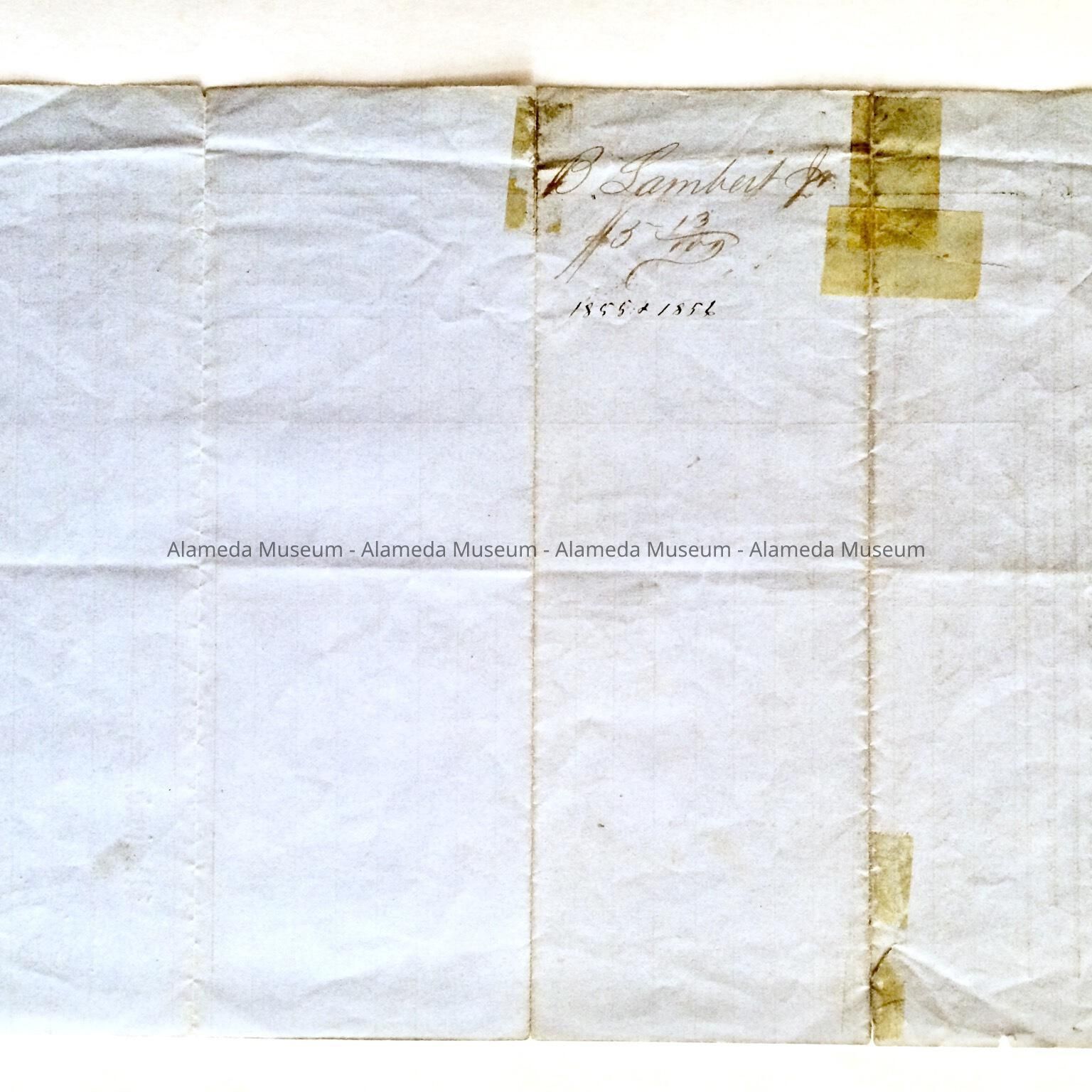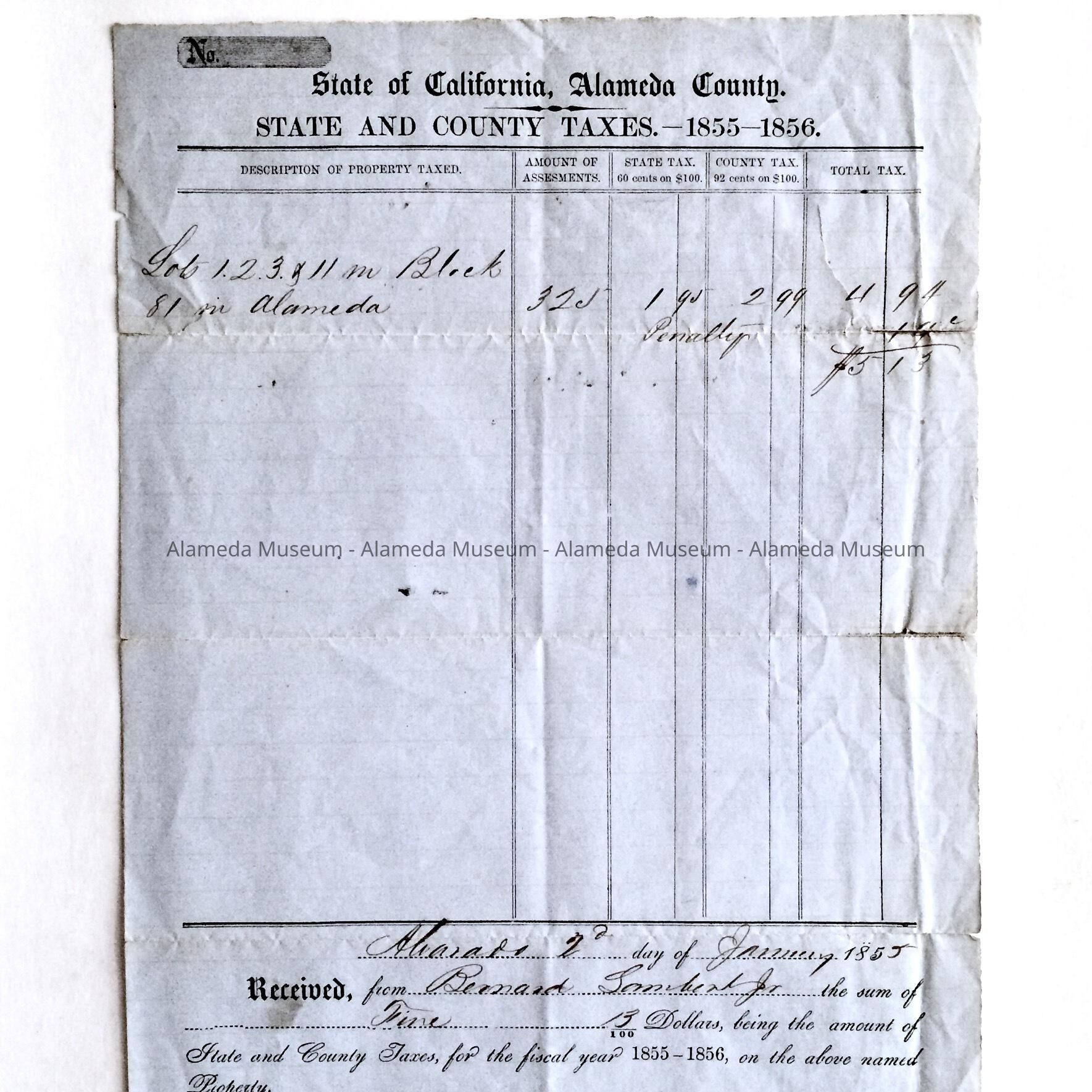 History of Object: Receipt for payment (fine) of State & County taxes, 1855-1856. Dated Jan. 2, 1855. For property situated at the northwest corner of Encinal Avenue & High Street. The owner, Bernard Lambert was the father of Mrs. Geo. Manley whose husband eventually built the present structure, 1301-05 High Street, in 1891.