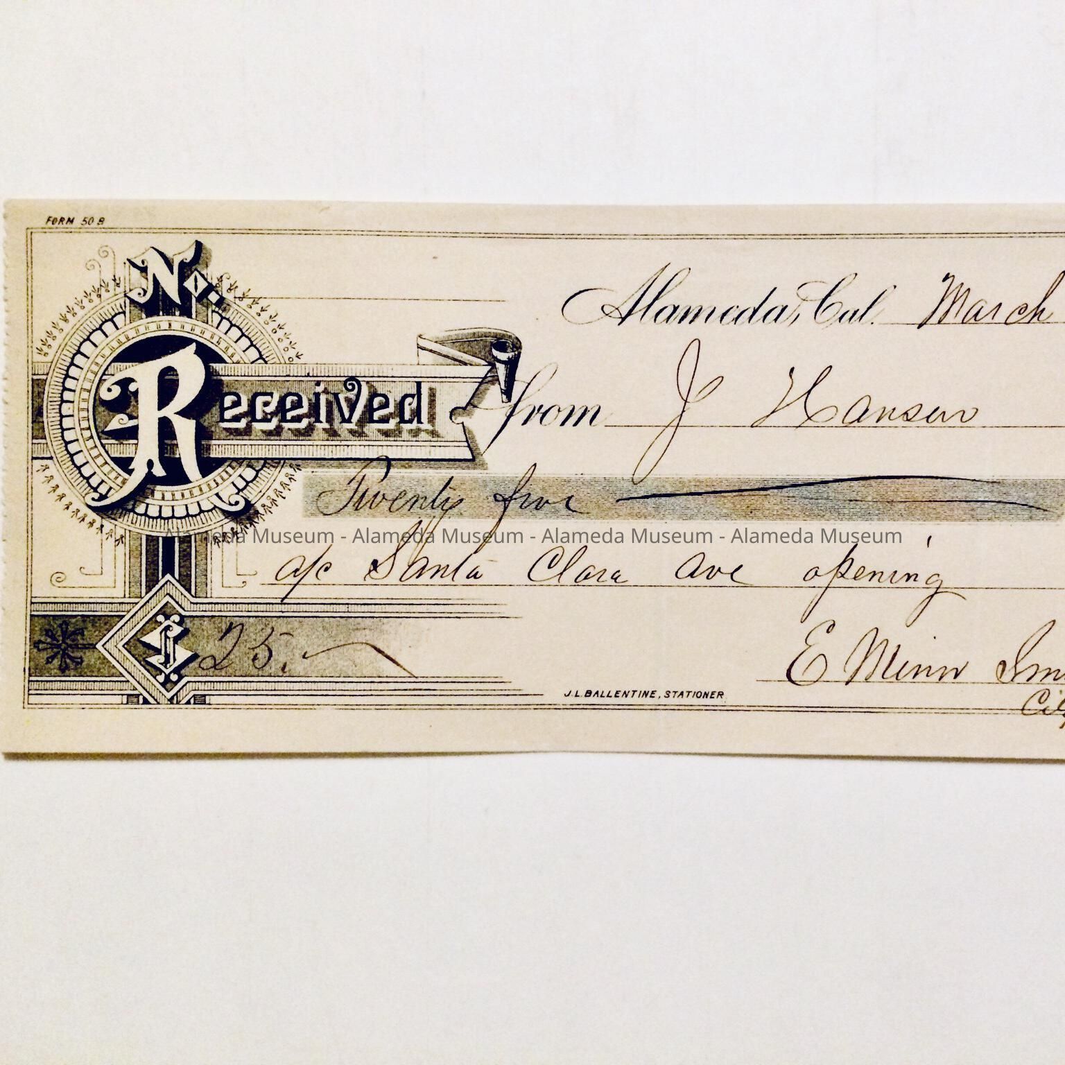 History of Object: Receipt made out to J. Hanson, dated March 19, 1895, for the Santa Clara Avenue opening, signed by E. Minor Smith, City Treasurer.