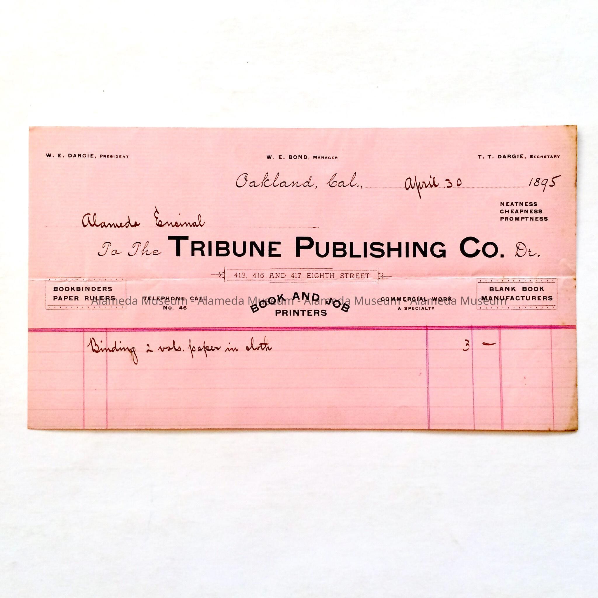 History of Object: Receipt from the Tribune Publishing Co., Oakland, for the binding of two volumes of the Alameda Encinal Newspaper (now in the possession of the Alameda Free Library-1985), dated April 30, 1895.