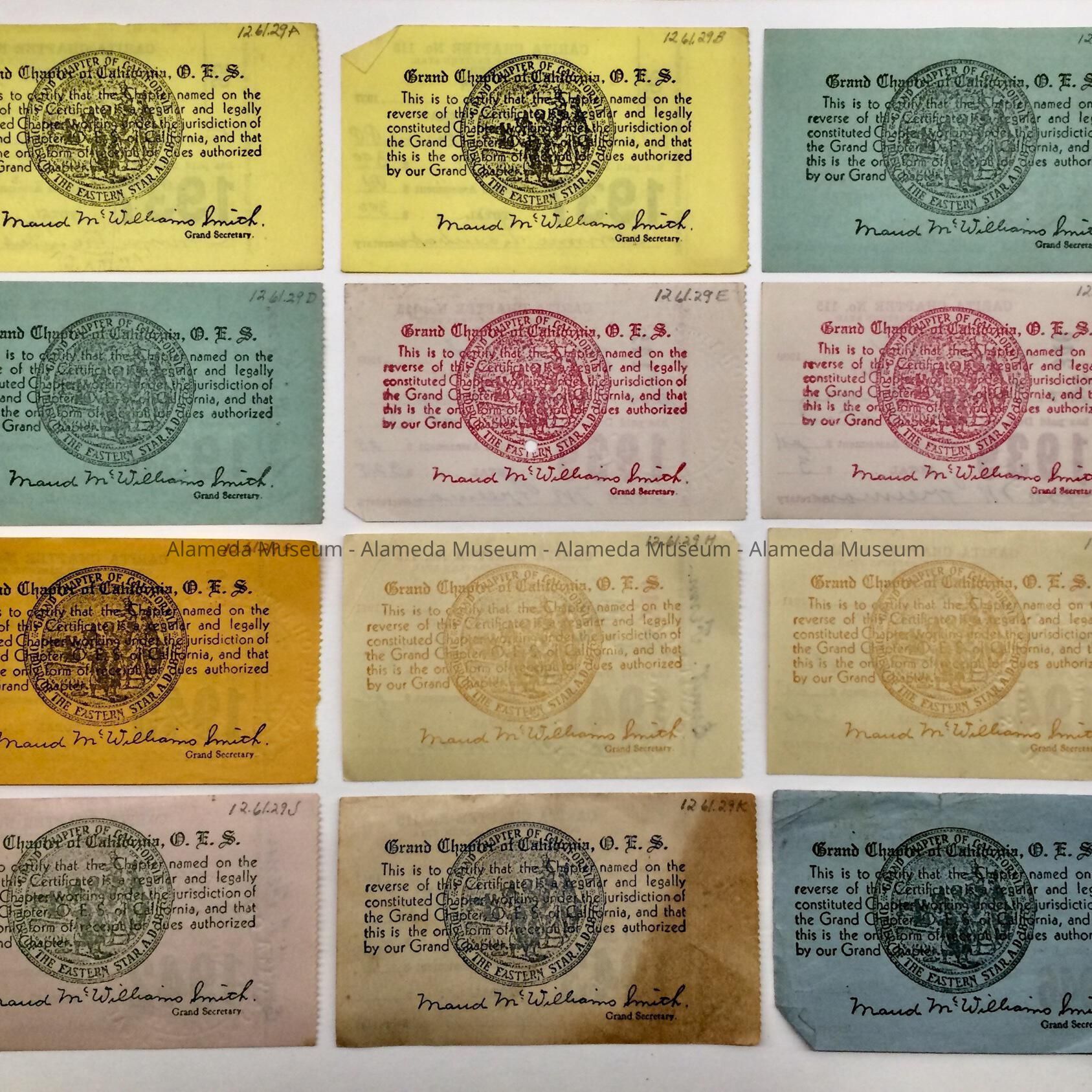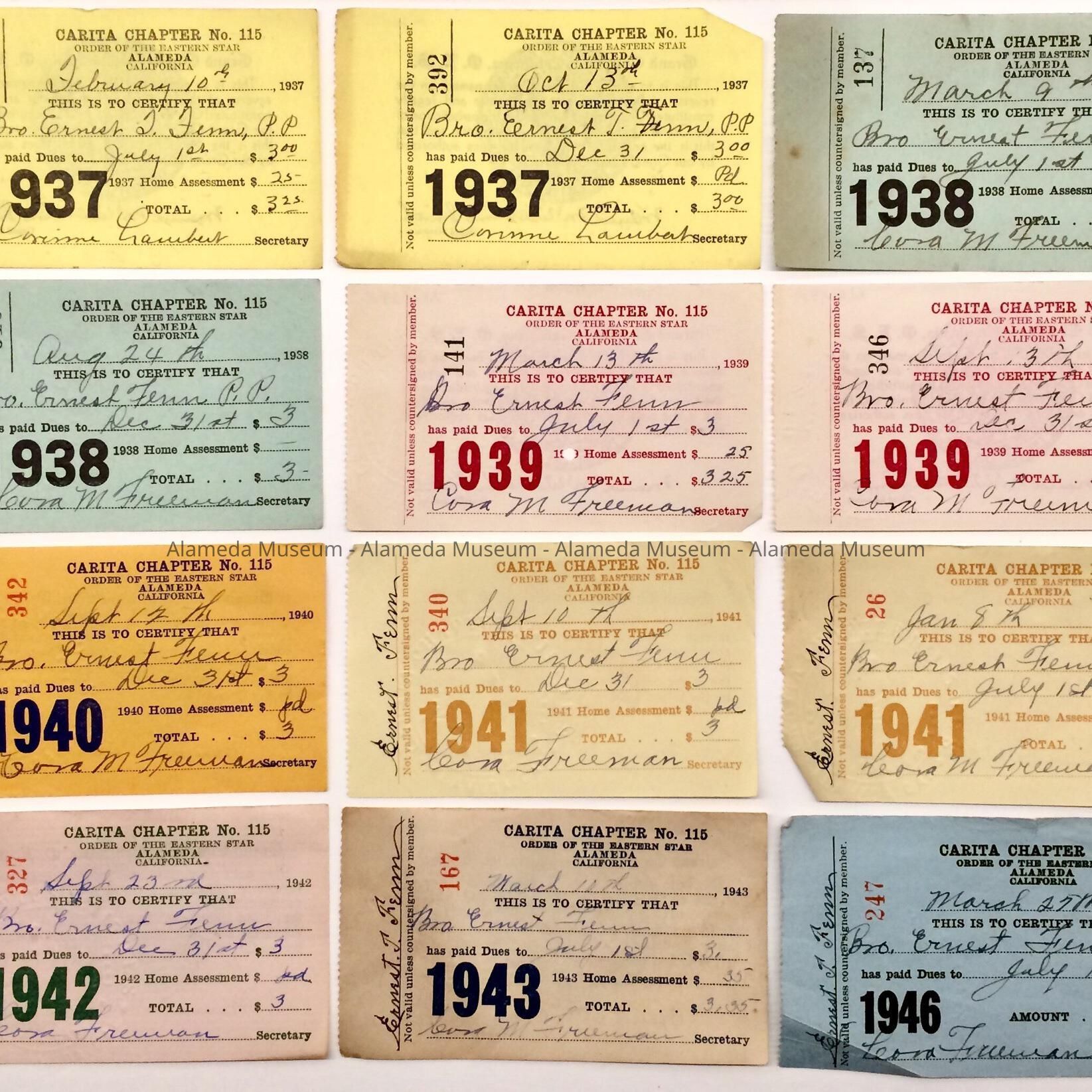 HISTORY OF OBJECTS: RECEIPT FORMS FOR PAYMENT OF DUES IN CARITA CHAPTER #115, ORDER OF THE EASTERN STAR, ALAMEDA. ERNEST FENN WAS A MEMBER.