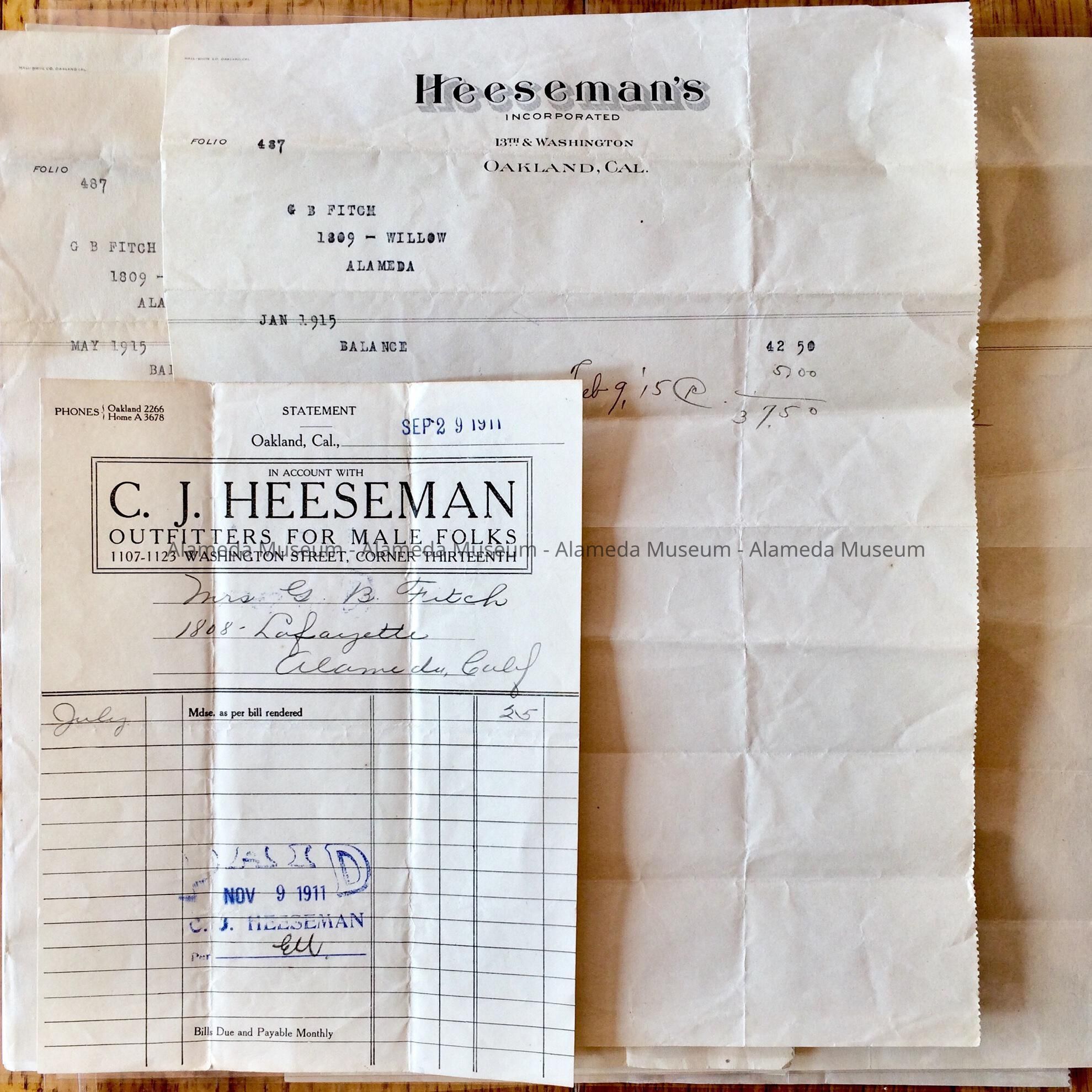 Description: A: a form, with print in black type on off-white paper, stating 'In Account with C.J. Houseman, outfitters for male folks', with blanks filled in by hand stating Mrs. G. B. Fitch, 1808 Lafayette, Alameda, and stamped Paid Nov 9 1911. B-F: Typed information on stationery with letterhead of 'C.J. Heeseman Incorporated', with typed information stating Mrs. G.B. Fitch, dates in 1913, 1914 and 1915 (D, E, & F).