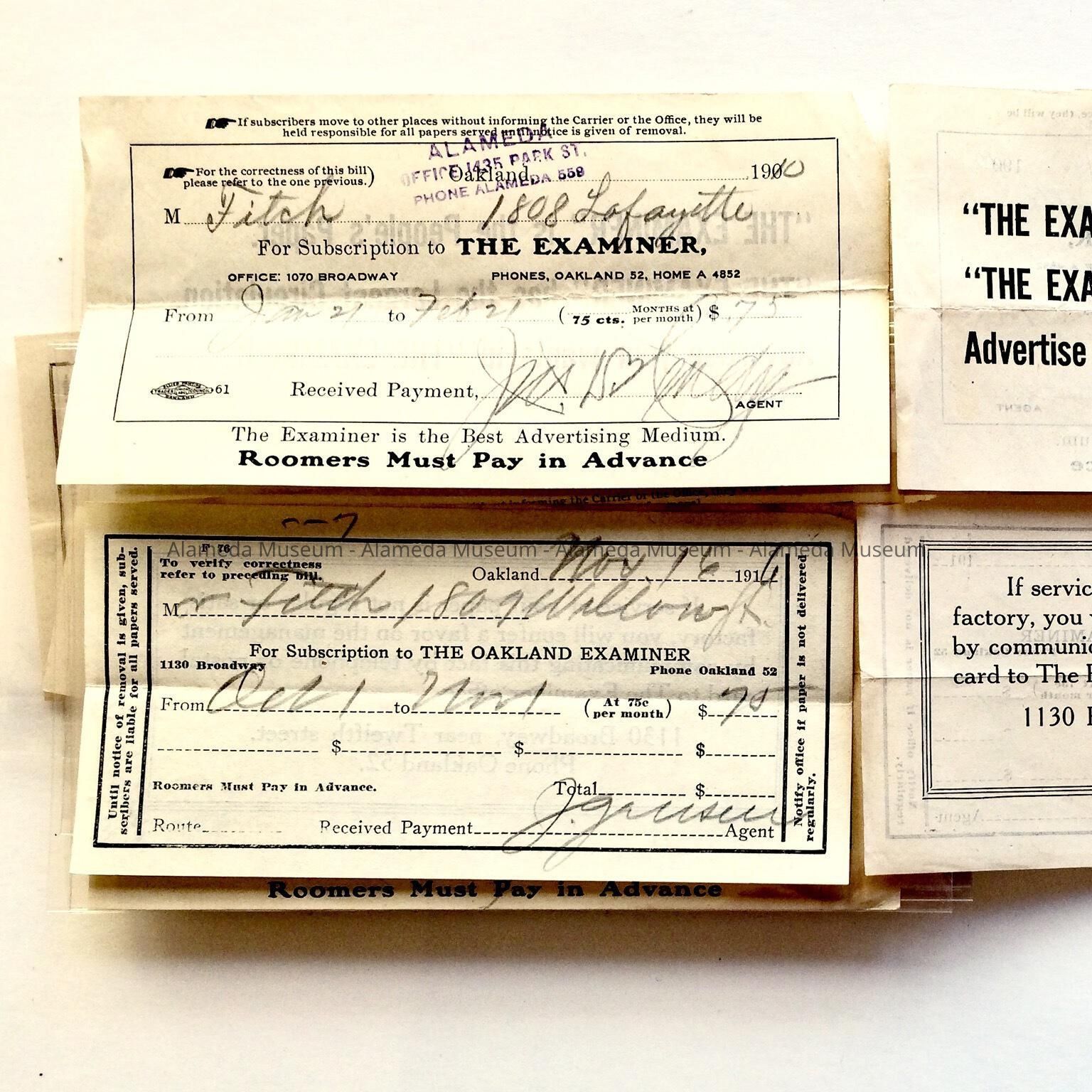 HISTORY OF OBJECTS: RECEIPTS FOR THE OAKLAND EXAMINER NEWSPAPER. SUBSCRIBER WAS THE FITCH FAMILY, 1808 LAFAYETTE ST, ALAMEDA AND 1809 WILLOW STREET, ALAMEDA.