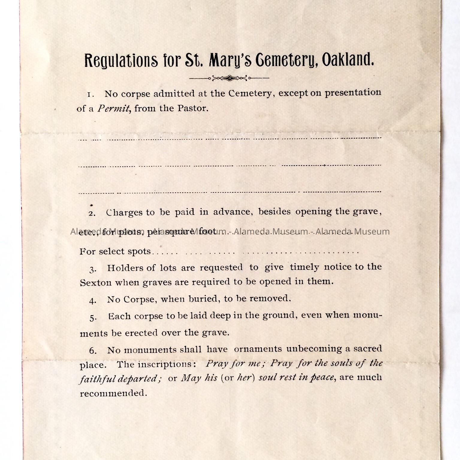 A. RECEIPT FORM, WITH BOLD-PRINTED CAPTION: "ST. MARY'S CEMETERY." INFORMATION BLANKS FILLED OUT IN INK.