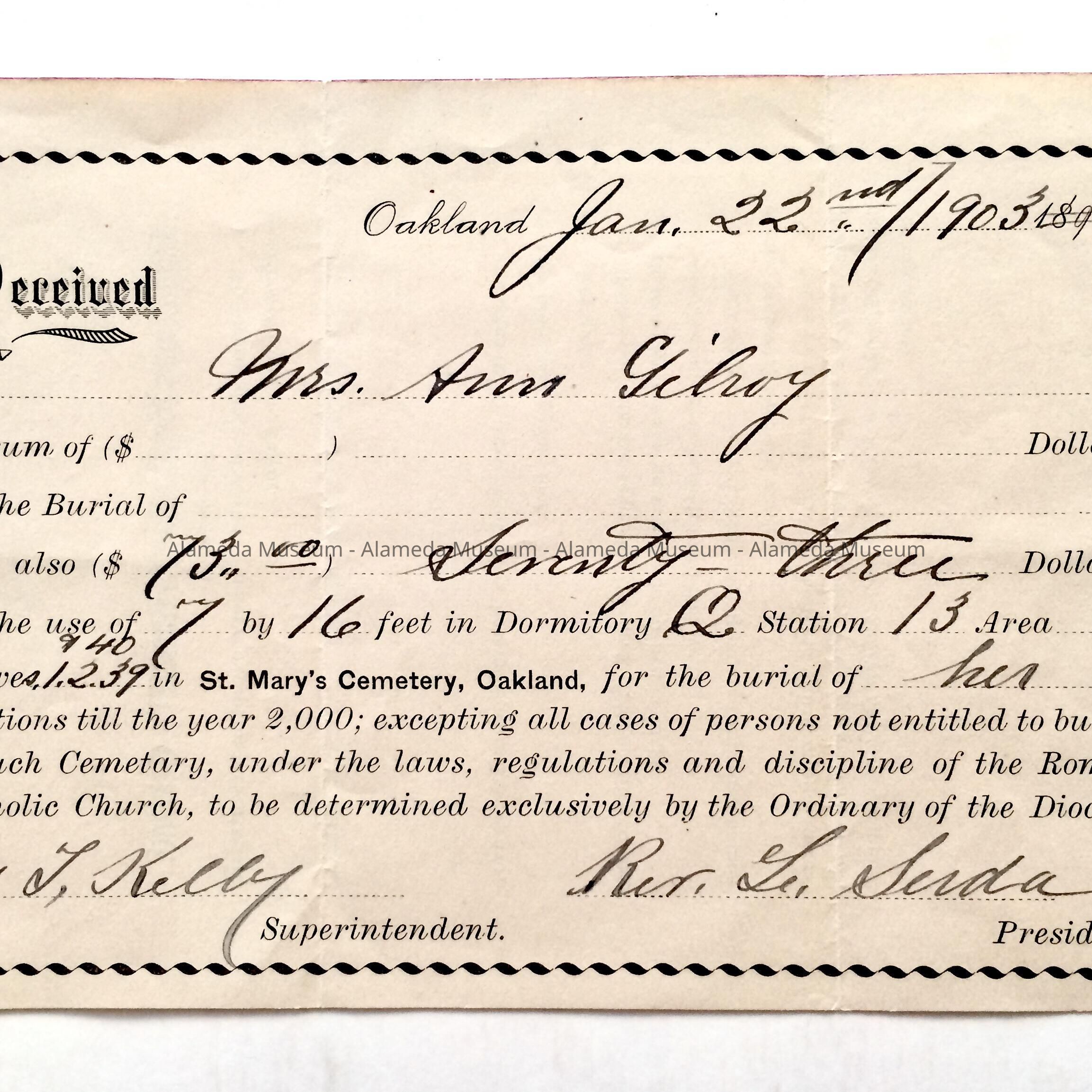 TWO RECEIPTS, DATED JANUARY 22, 1903, MADE OUT TO MRS ANN GILROY. RECEIPT "A" IS PAYMENT FOR PERPETUAL CARE FOR GRAVES 1, 2, 39, 40, ST. MARY'S CEMETERY. RECEIPT "B" IS FOR A BURIAL OF THE ABOVE GRAVE SITE. MRS GILROY WAS THE MATERNAL GRANDMOTHER OF THE LATE ANNE MACDONALD, WHO DIED IN ALAMEDA ON JANUARY 19, 1991. MS MACDONALD CAME TO ALAMEDA AT THE AGE OF 4. MR AND MRS NEIL CLARK WERE EXECUTORS OF HER ESTATE.