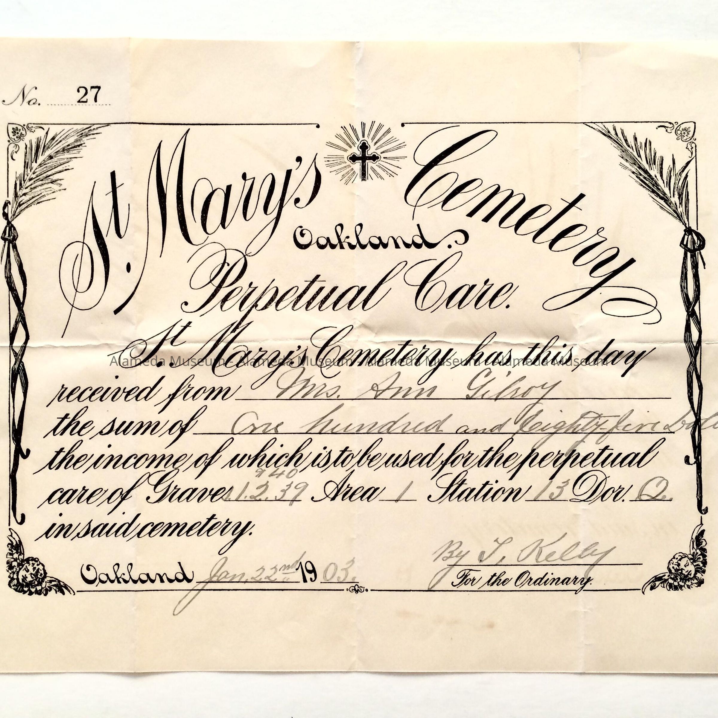 Receipts for perpetual care burial Ann Gilroy at St. Mary's Cemetery, 1903Entry/Object ID