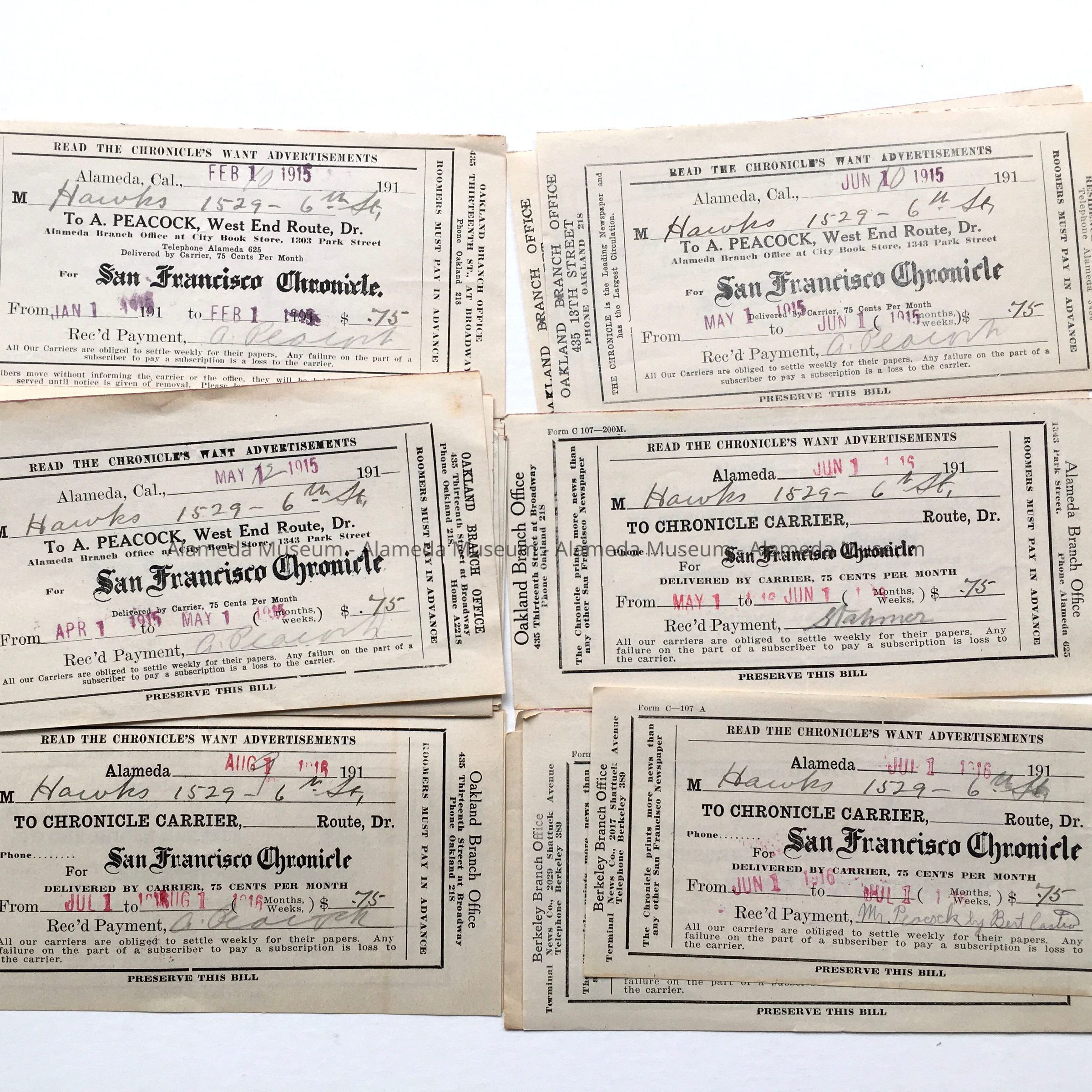 HISTORY OF OBJECT: RECEIPTS FOR THE ALAMEDA DISTRIBUTION CENTER OF THE SAN FRANCISCO CHRONICLE. PATRON WAS THE HAWKS FAMILY OF 1529 SIXTH STREET, ALAMEDA, CA.