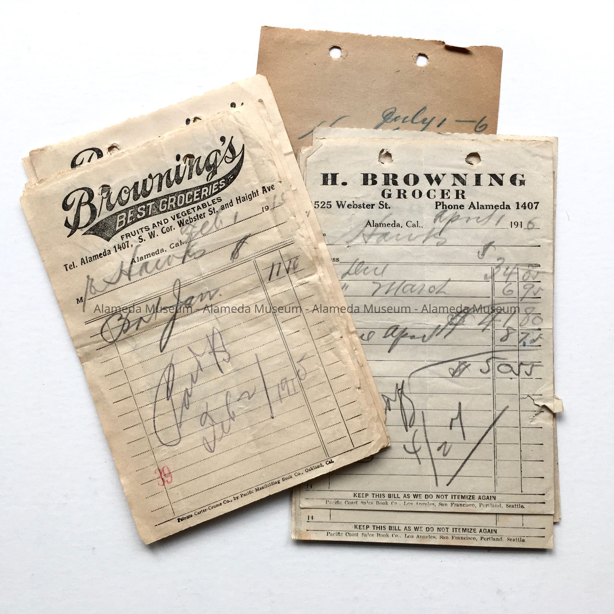 HISTORY OF OBJECT: RECEIPT FROM BROWNING'S GROCERY; TELEPHONE: Alameda 1407; SOUTHWEST CORNER, WEBSTER STREET AND HAIGHT AVENUE, ALAMEDA.