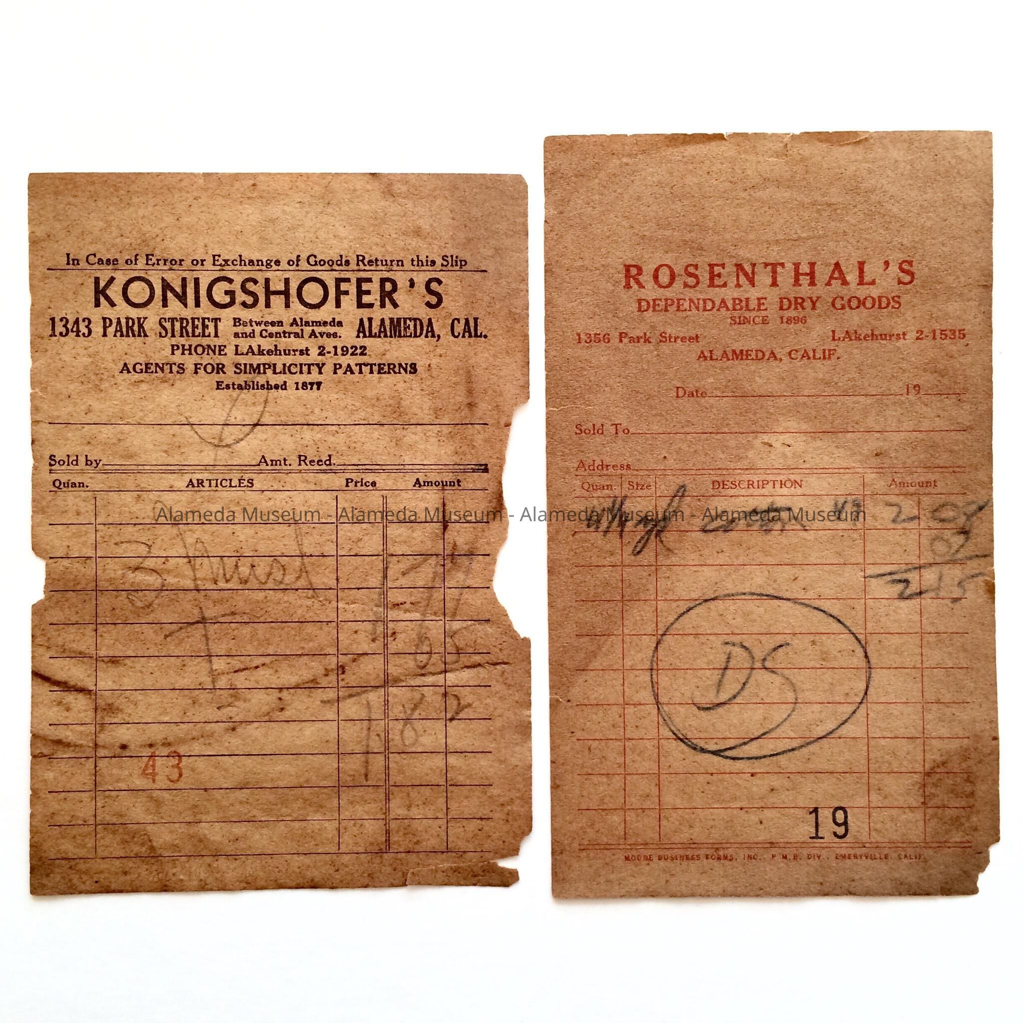 History of Object: Receipt for muslin from Konigshofer's, 1343 Park Street, and for cotton from Rosenthal's, 1356 Park Street. Both receipts list the phone number as Lakehurst, suggesting 1950s.
