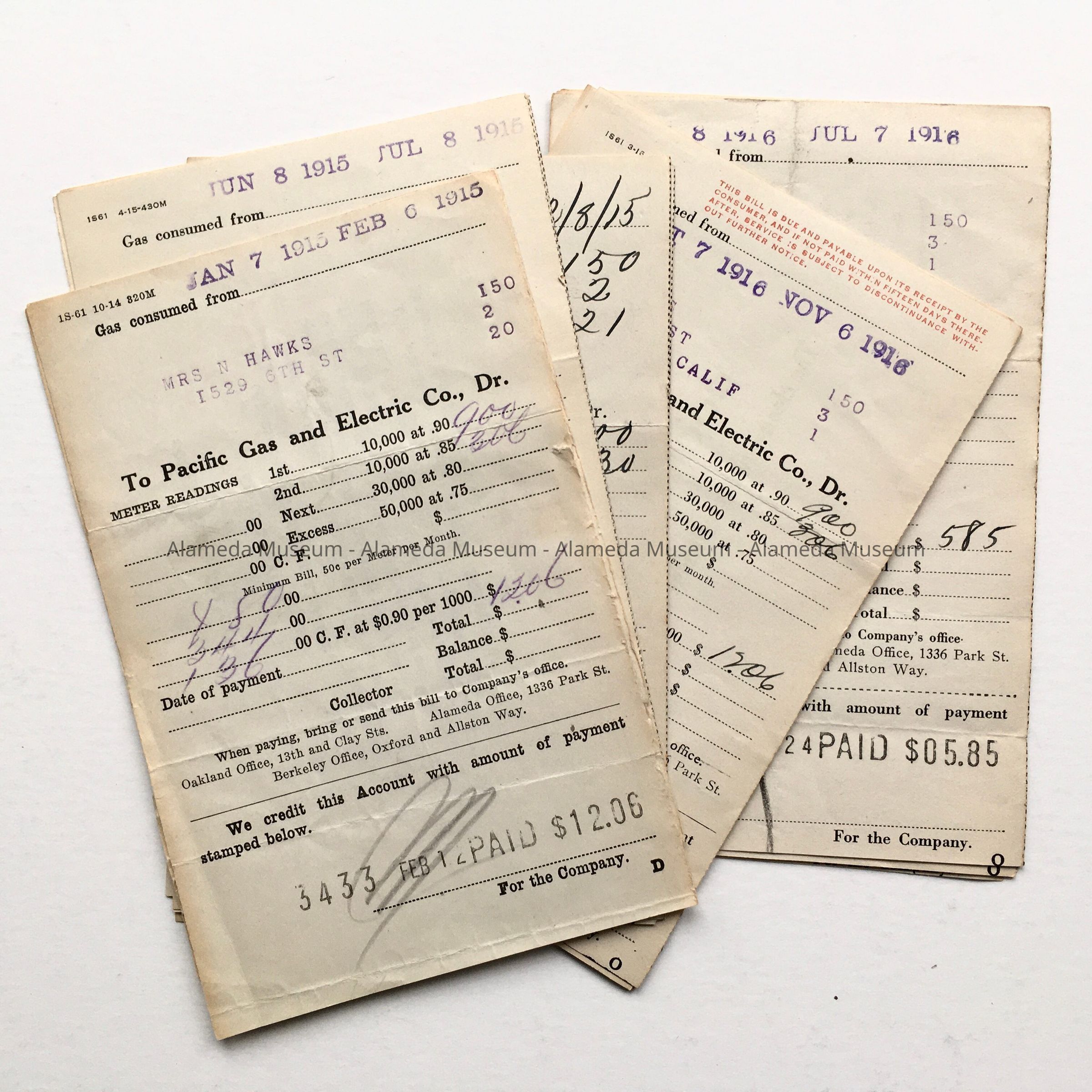 HISTORY OF OBJECT: RECEIPTS FROM THE P G & E COMPANY, FOR 1915-1916, MADE OUT TO MRS N HAWKS, 1529 SIXTH STREET, ALAMEDA, CALIFORNIA.