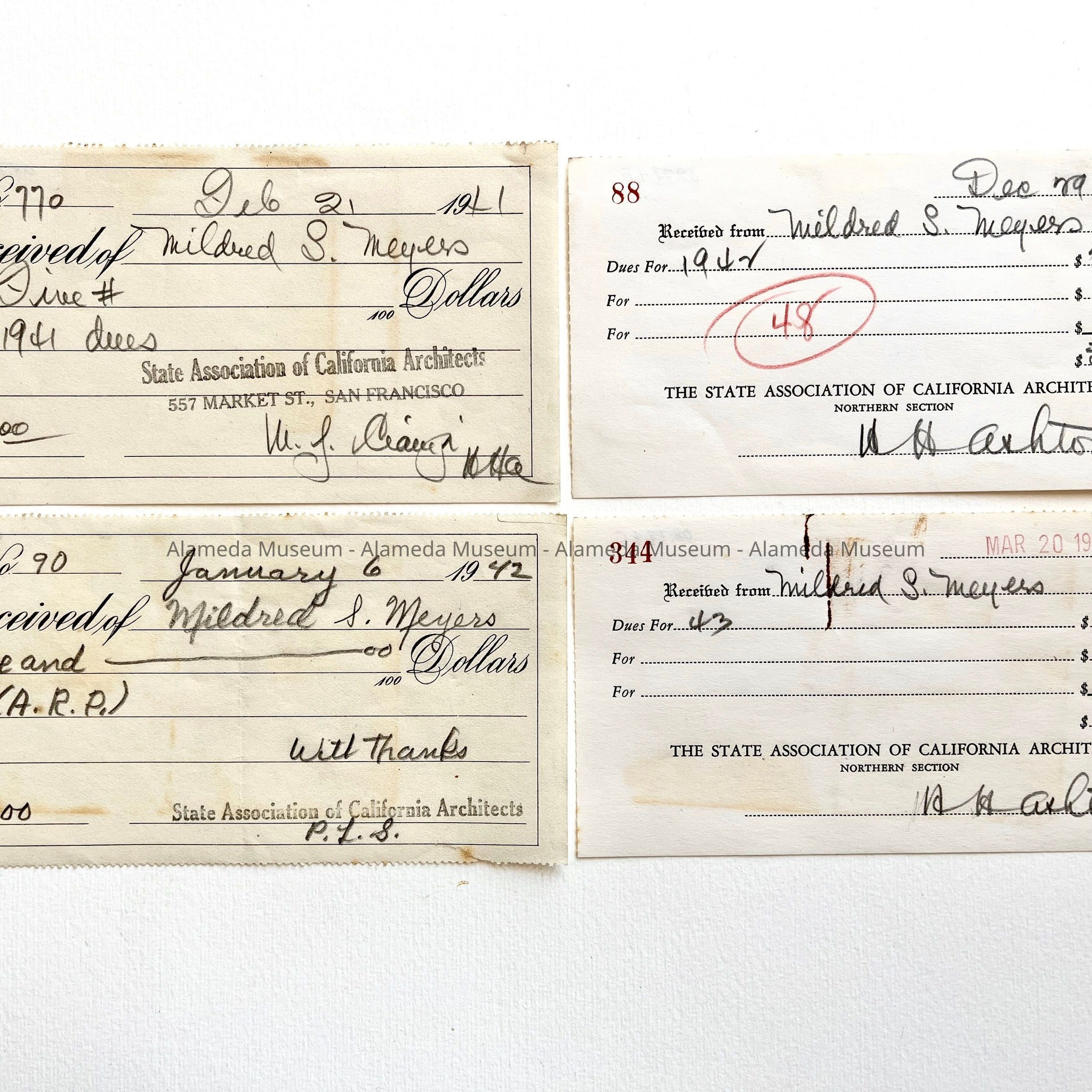 HISTORY OF OBJECTS: RECEIPTS FOR PAYMENT OF DUES FROM THE STATE ASSOCIATION OF CALIFORNIA ARCHITECTS, ISSUED TO MILDRED MEYERS FOR HER MEMBERSHIP.