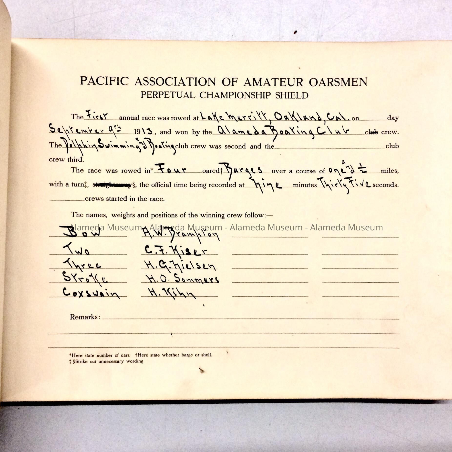 Record Book of boat races of Pacific Association of Amateur Oarsman, 1913Entry/Object ID