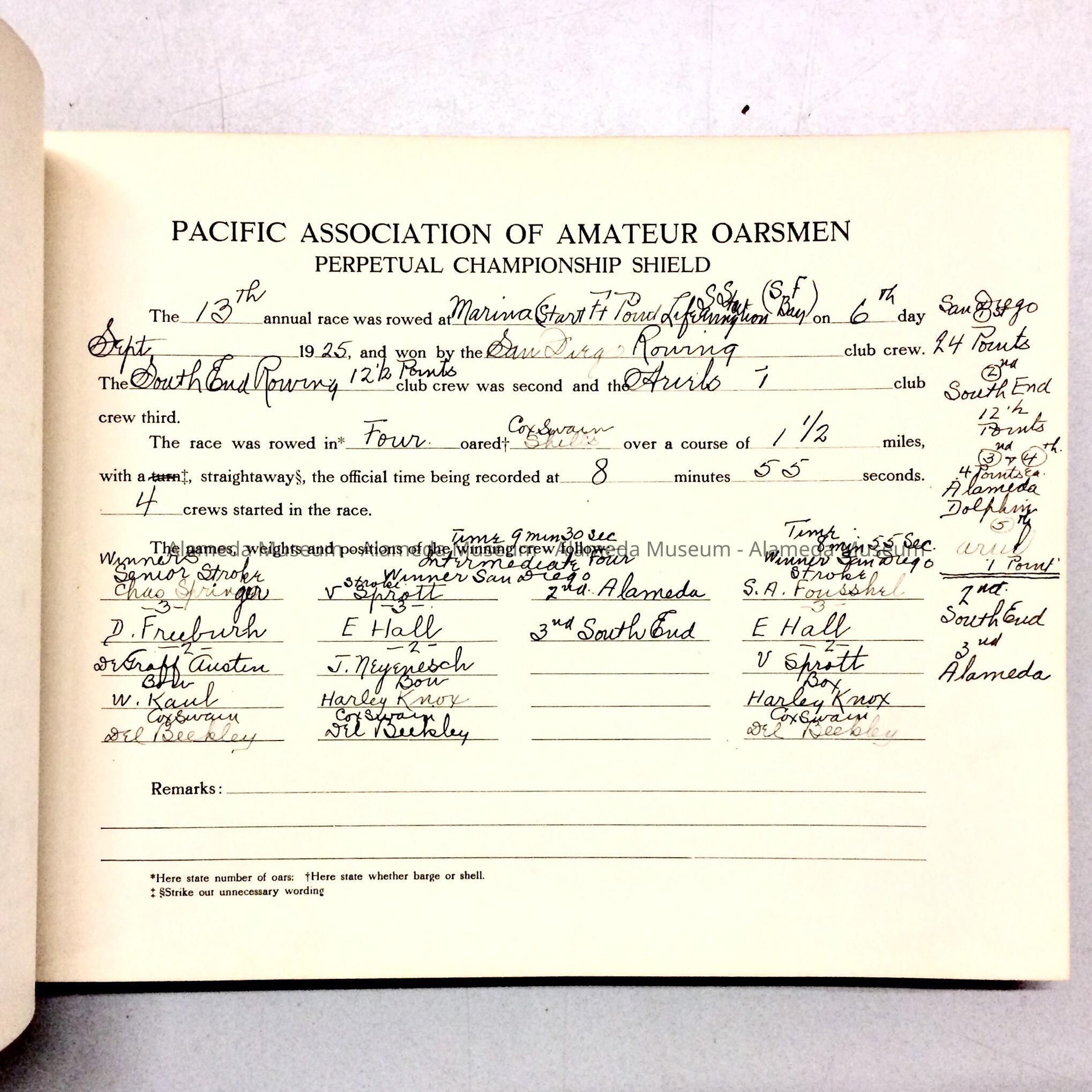 History of Object: Log book containing the recorded boat races of the Pacific Association of Amateur Oarsmen. Included in the records are races won by the Alameda Boating Club.
