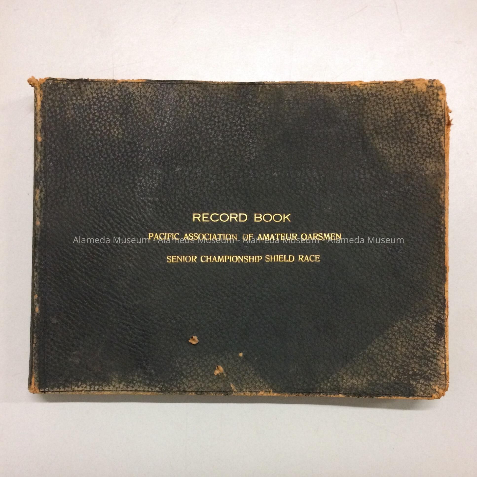 Description: Record book, black leather cover with incised gold lettering stating "Record Book," "Pacific Association of Amateur Oarsmen," "Senior Championship Shield Race."
