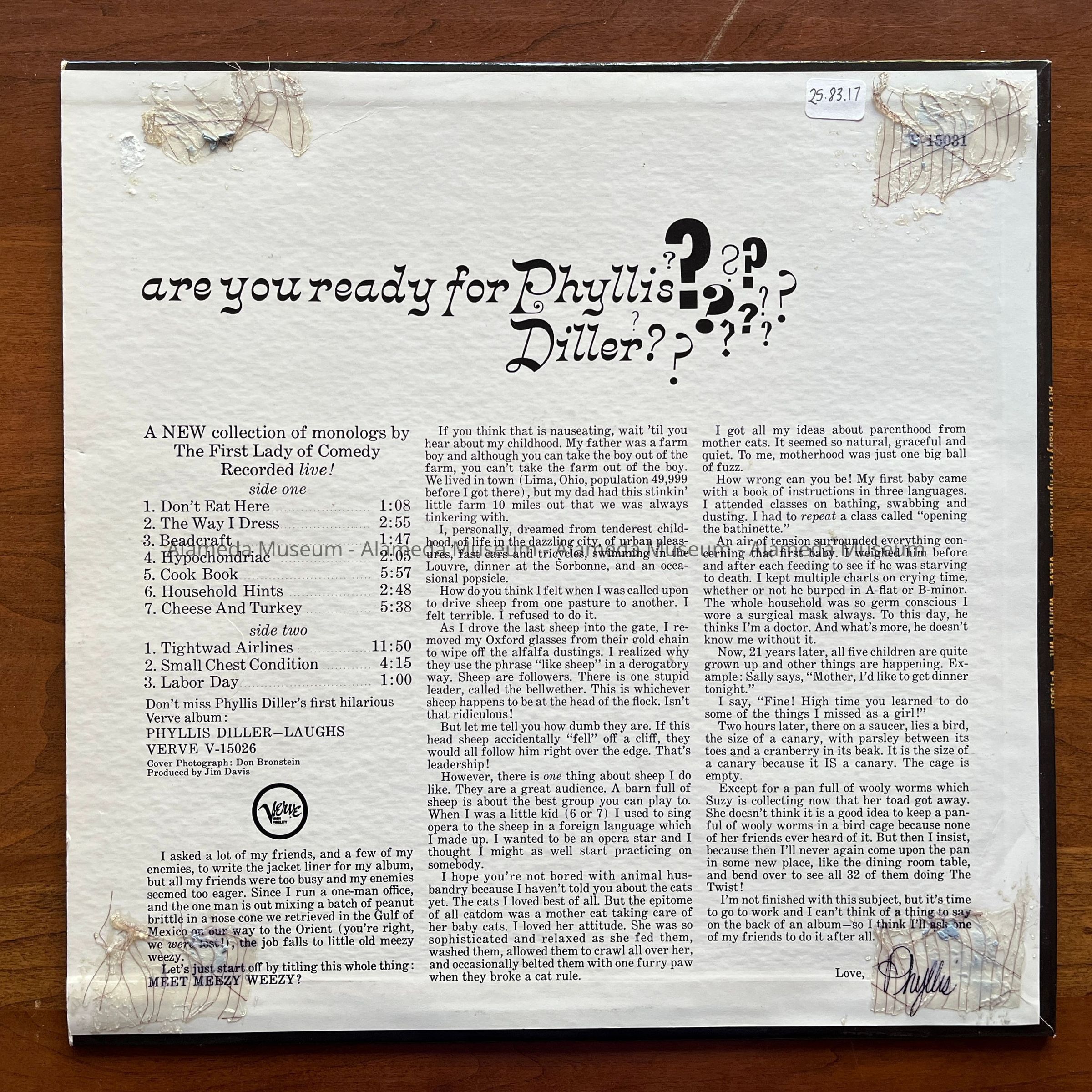 History of Object: Empty record sleeve of a Phyllis Diller comedy recording.