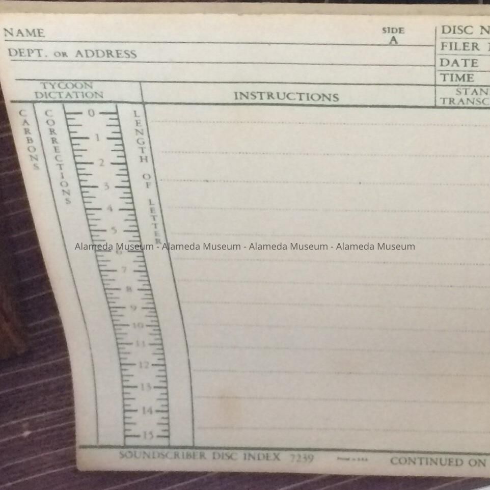 Index sheet used in conjunction with disc type recording machine, found while moving the contents of the Chamber of Commerce from their building in the 2400 block of Santa Clara Avenue to the basement of the Alameda City Hall. It is said to have been used by the Chamber of Commerce, which was founded in 1927.