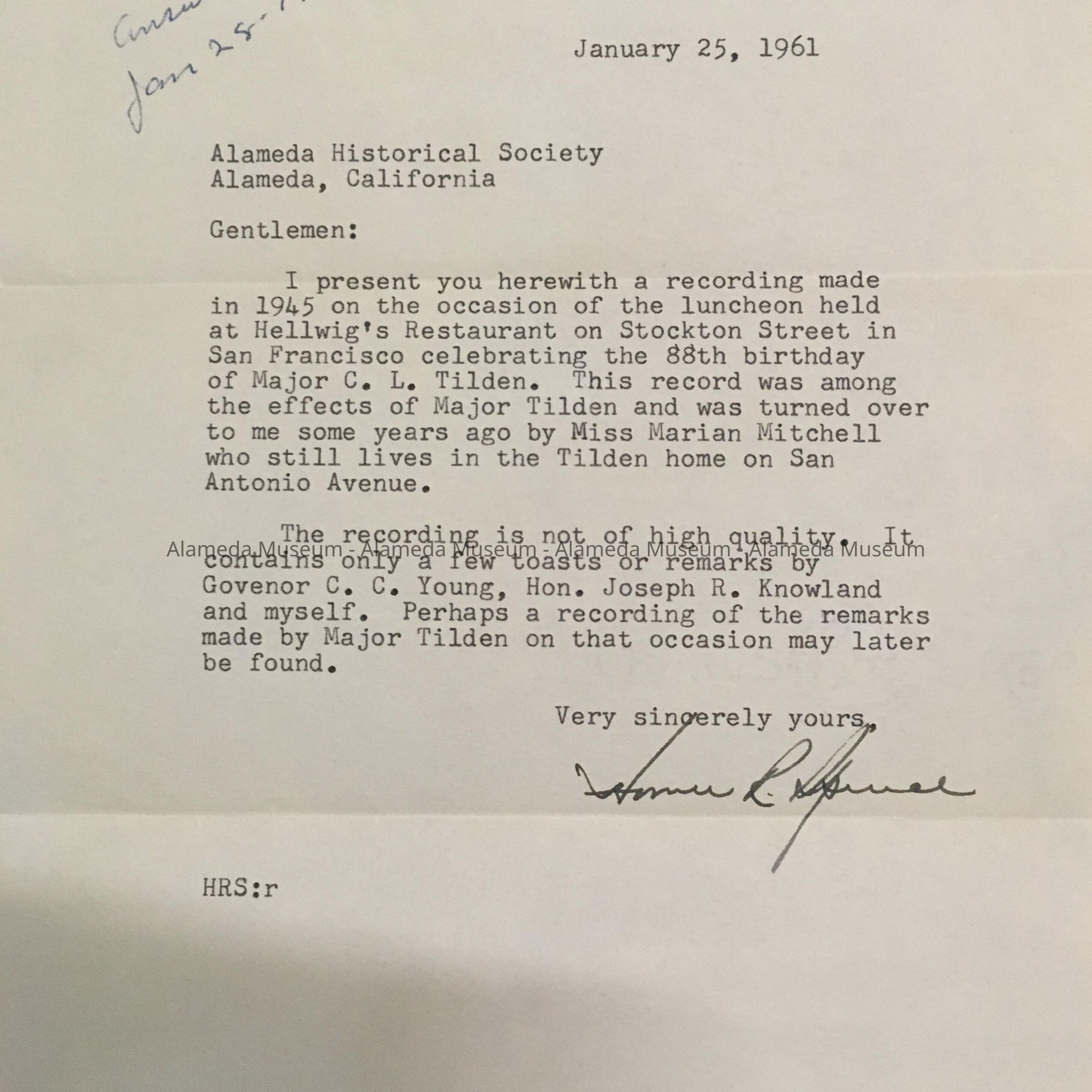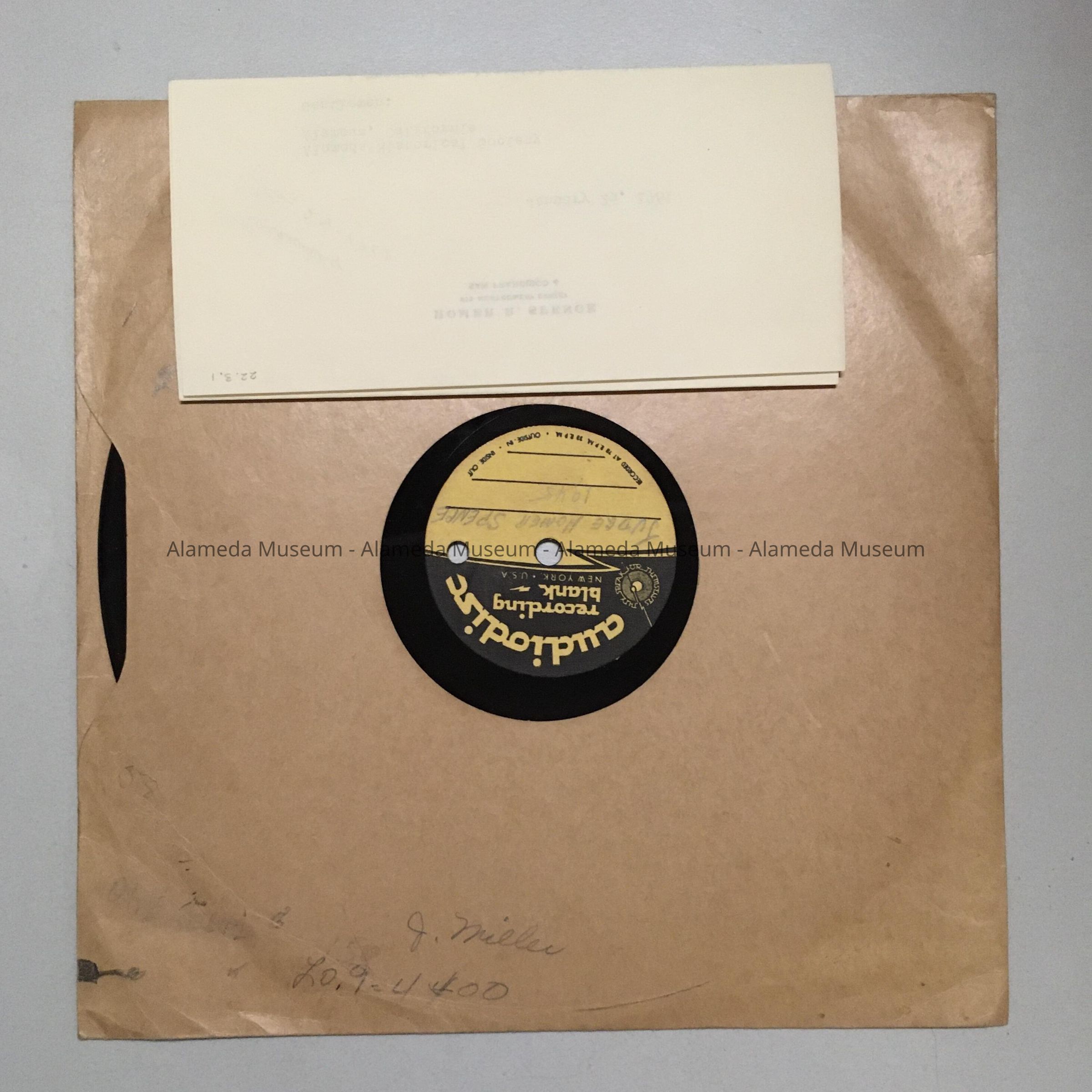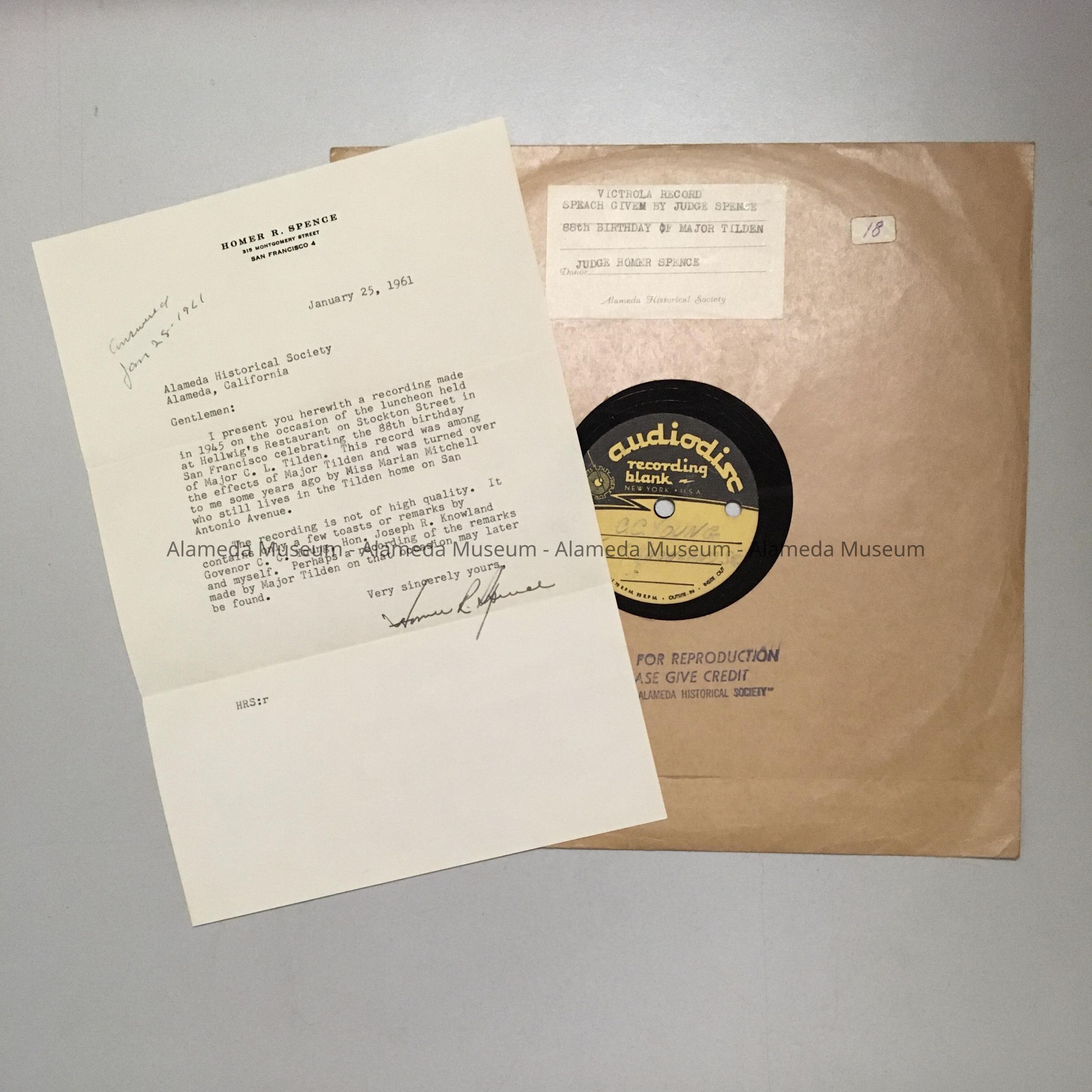 History of Object: Recording made in 1945 on the occasion of a luncheon celebrating the 88th birthday of Major C. L. Tilden. The record was among the effects of Major Tilden, and turned over to Judge Spence by Miss Marian Mitchell, who lived in the Tilden home on San Antonio Ave, and letter by Judge Spence dated January 25, 1961, describing the object. According to the letter, the recording is not of high quality, and contains the voices of Governor C. C. Young, the Hon. Joseph R. Knowland, and Judge Spence. The record was given old (pre-1972) catalog number 18, but was never added to the card catalog system.