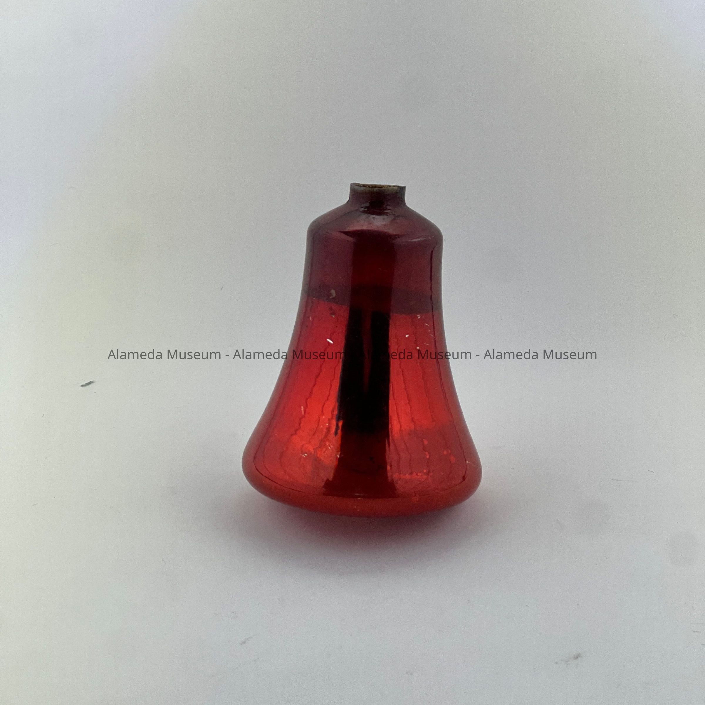 Description: Red glass ornament that is in the shape of a bell. There is no metal cap to help place the ornament on a Christmas tree.