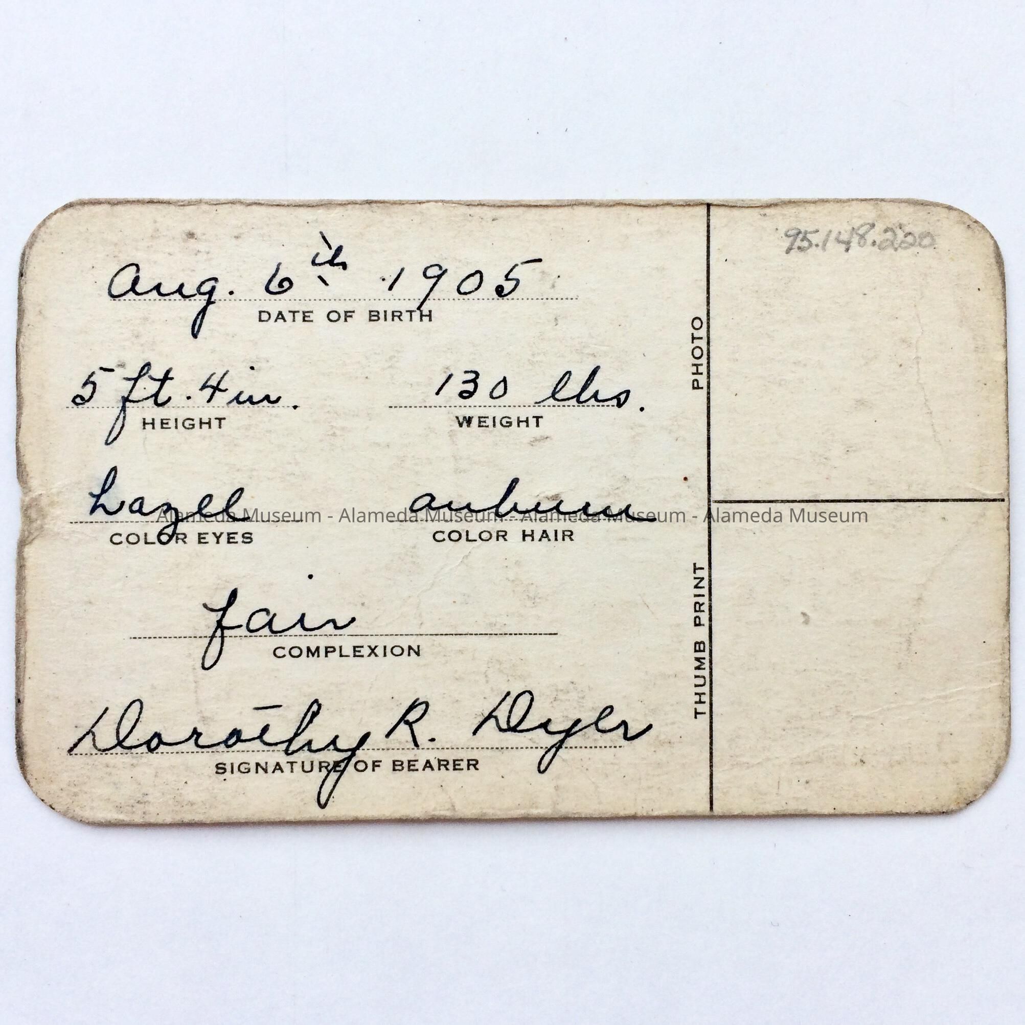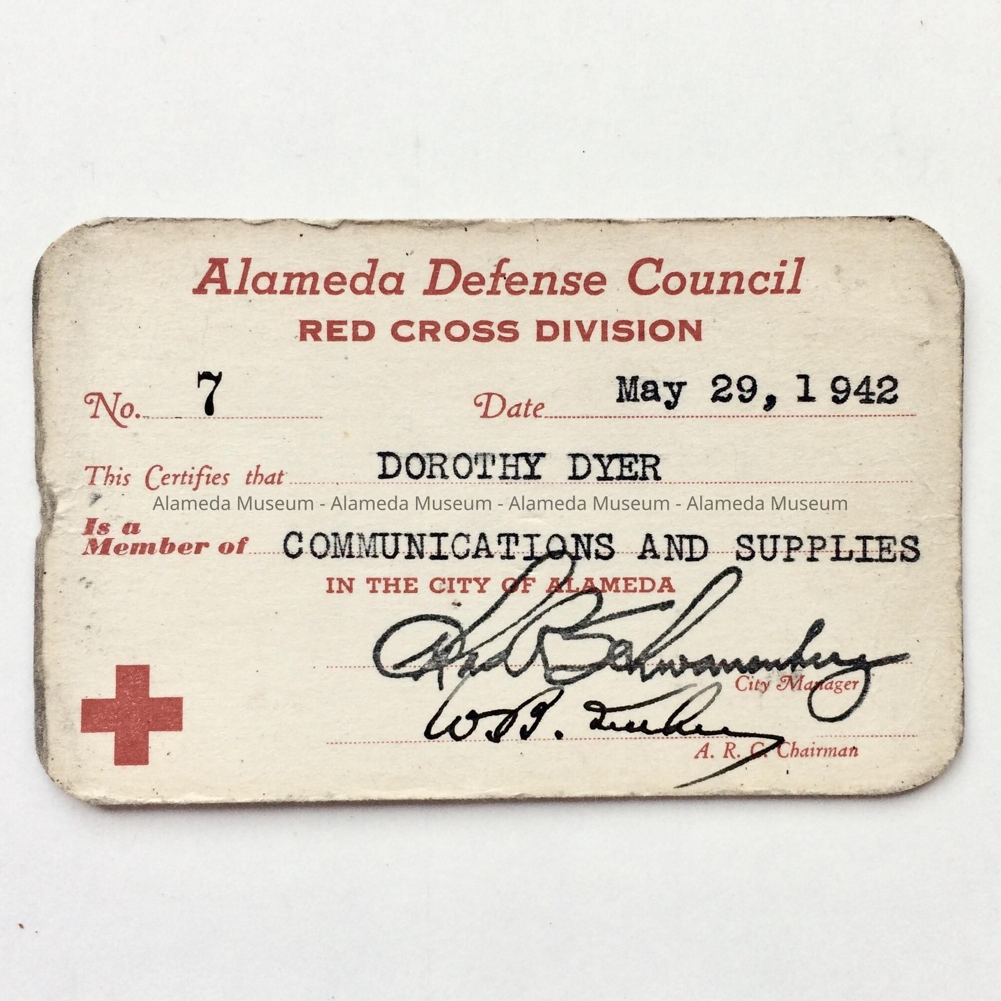 IDENTIFICATION CARD ISSUED TO DOROTHY DYER, MAY 29, 1942, FROM THE RED CROSS DIVISION, ALAMEDA DEFENSE COUNCIL, CITY OF ALAMEDA, CALIFORNIA.