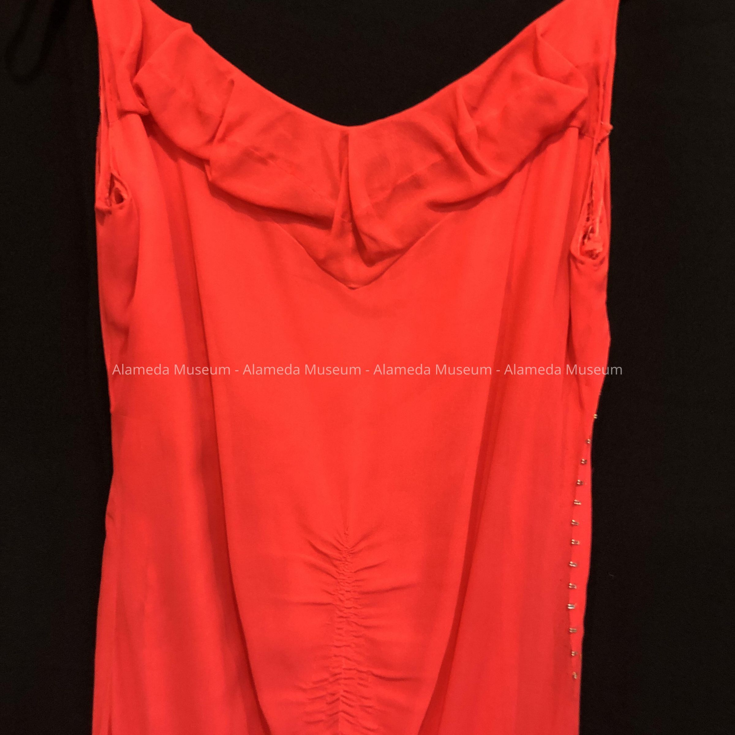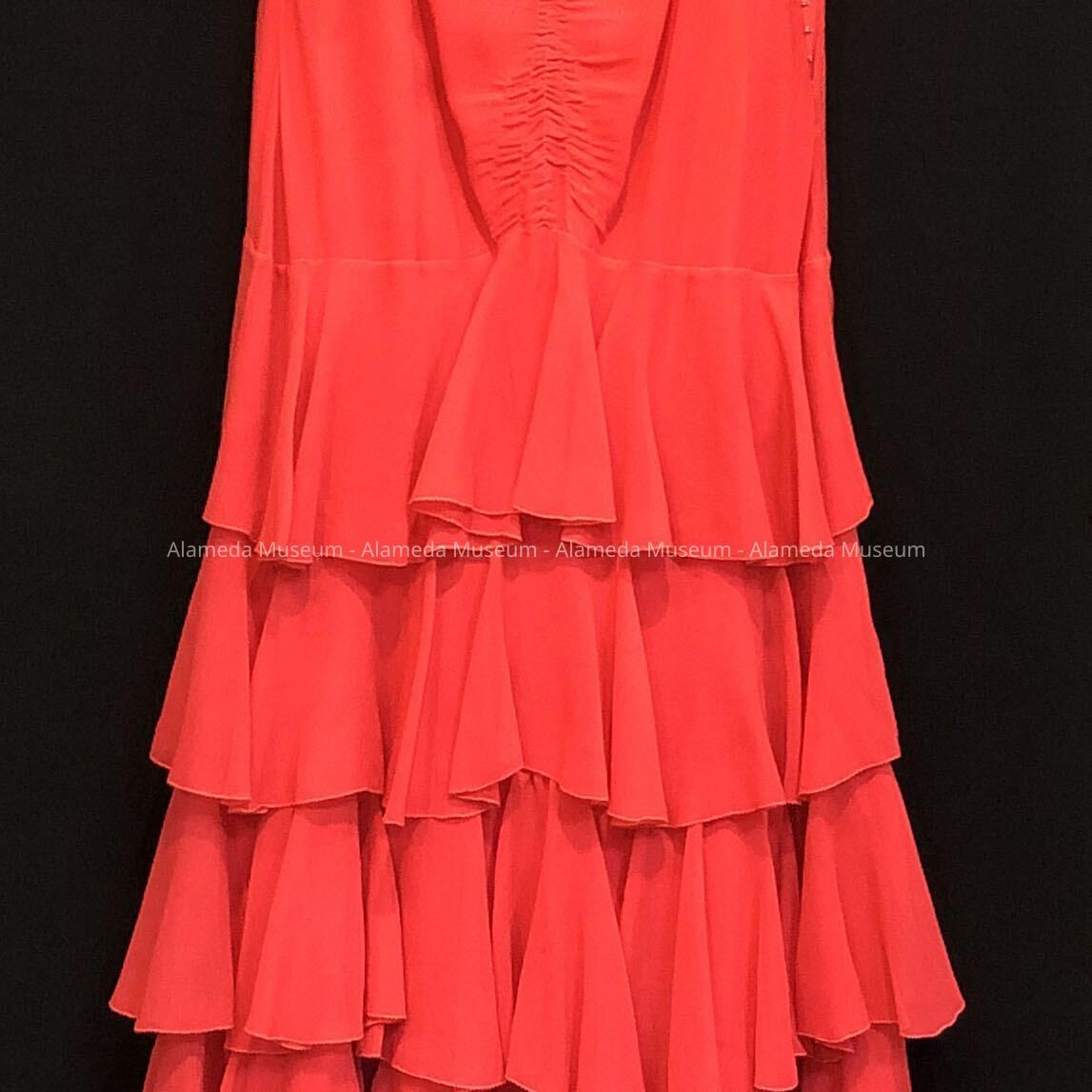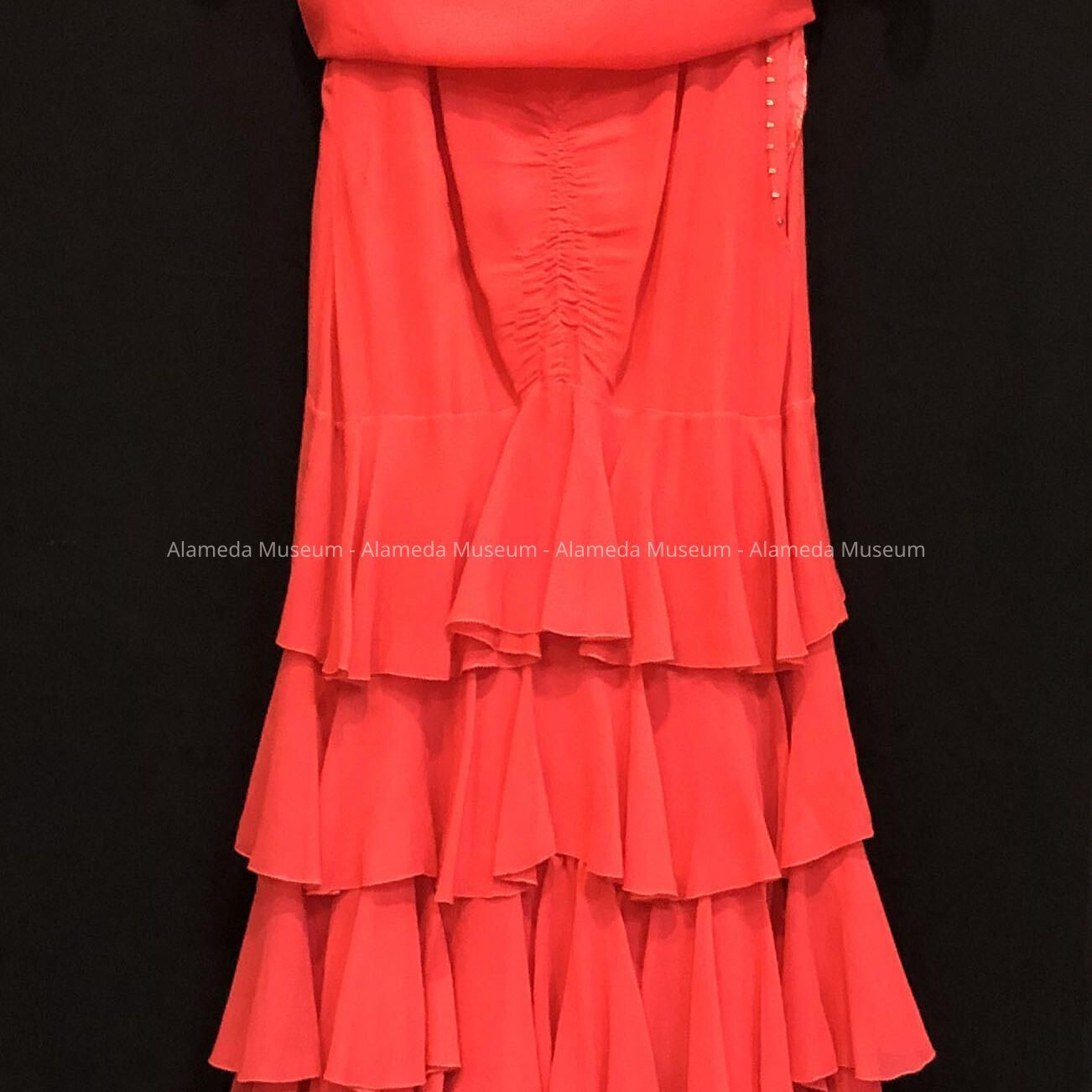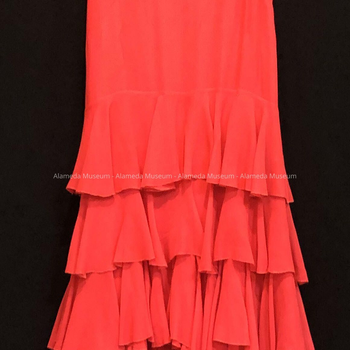 Description: Watermelon red georgette dress has a low-cut V-neckline, and is sleeveless with thin straps. Six ruffles on the long skirt. Attached taffeta petticoat. The matching bolero jacket has short sleeves.