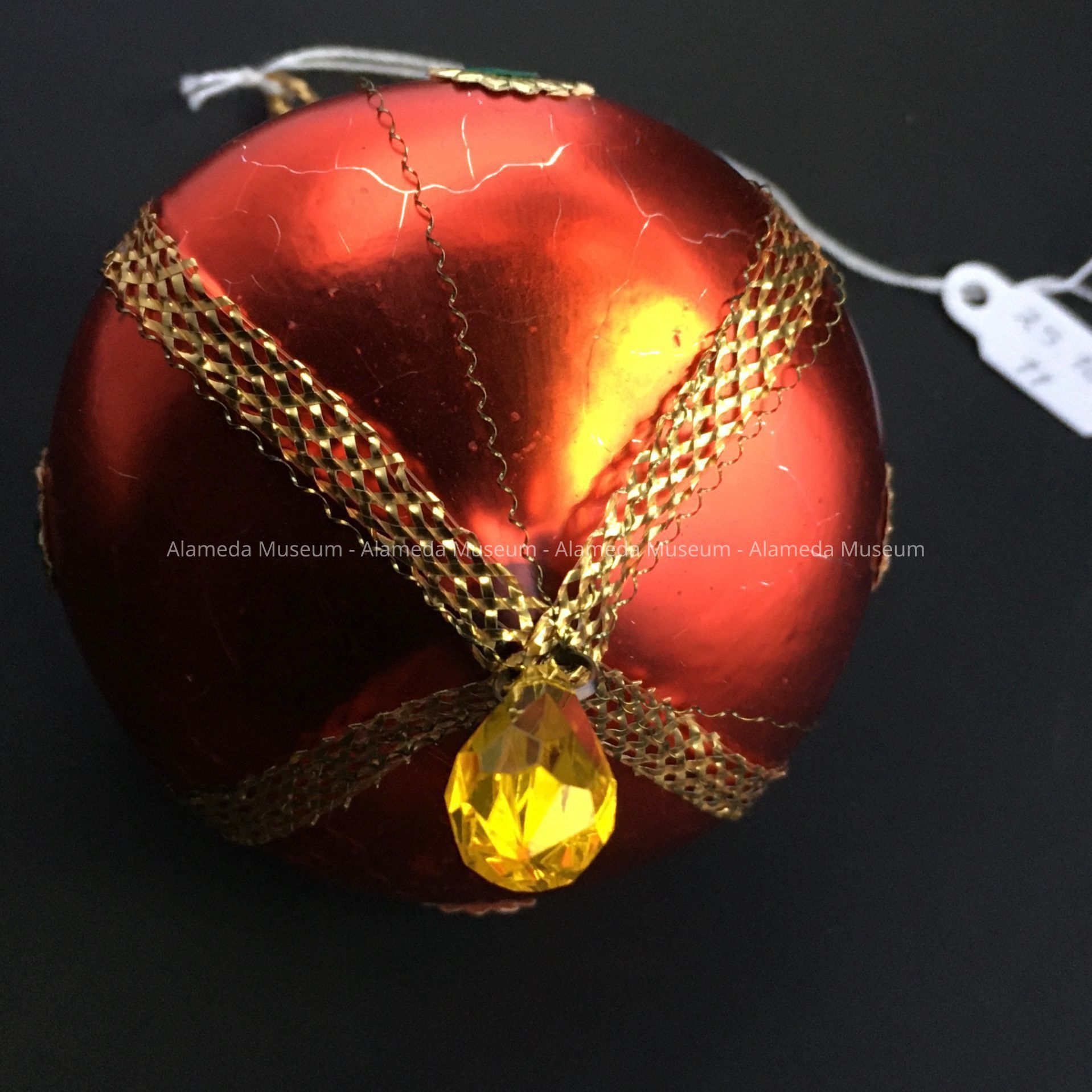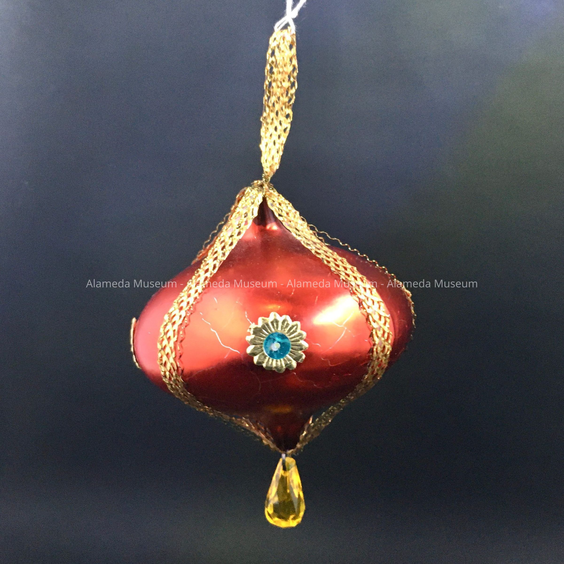 Description: An ellipsoidical ornament of metallic red-colored glass, with a tube at the top, a yellow cut-glass pendant at the bottom, held in a net with loop for hanging, of four strands of open-worked gold-colored ribbon, and strands of crinkled, thin, gold-colored wire. Four daisy-shaped decorations are placed equidistant on the widest part of the ellipsoid.