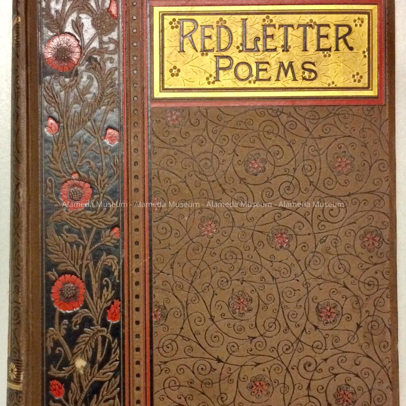 HARD-BOUND BOOK, WITH BUCKRAM COVER IN BROWN, WITH A PATTERN OF RED AND BROWN FLOWERS ON A BLACK BACKGROUND. CAPTION ON COVER AND SPINE --- IN BLACK ON A GOLD BACKGROUND --- "RED LETTER POEMS."