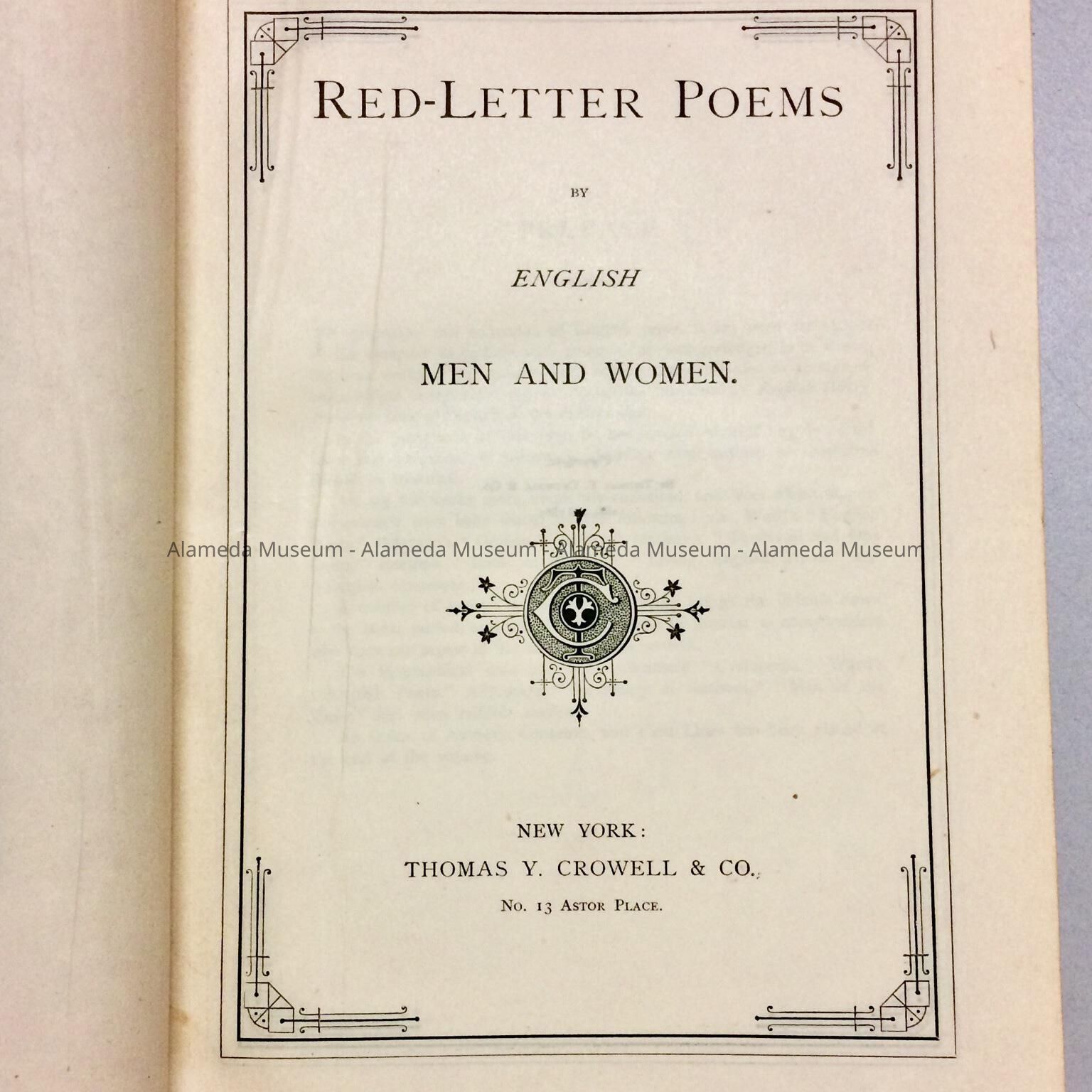 BOOK ENTITLED, "RED LETTER POEMS BY ENGLISHMEN AND - WOMEN," PRINTED IN NEW YORK BY THOMAS Y CROWELL & COMPANY. TEXT IS ILLUSTRATED. BOOK FROM THE BLAKE-DYER RESIDENCE, CLINTON AVENUE, ALAMEDA, CA.