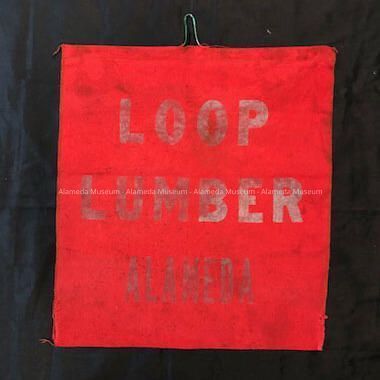 Description: Red colored heavy cotton sign, in flag form, with bold stenciled lettering (in silver) stating "Loop Lumber-Alameda." Sign supported & suspended by metal hanger sewn in upper seam.