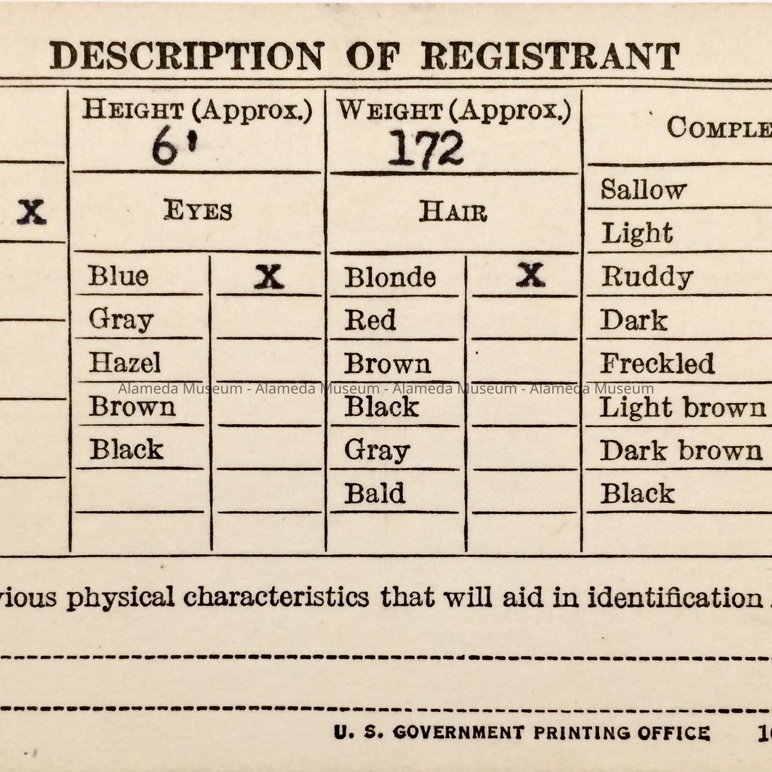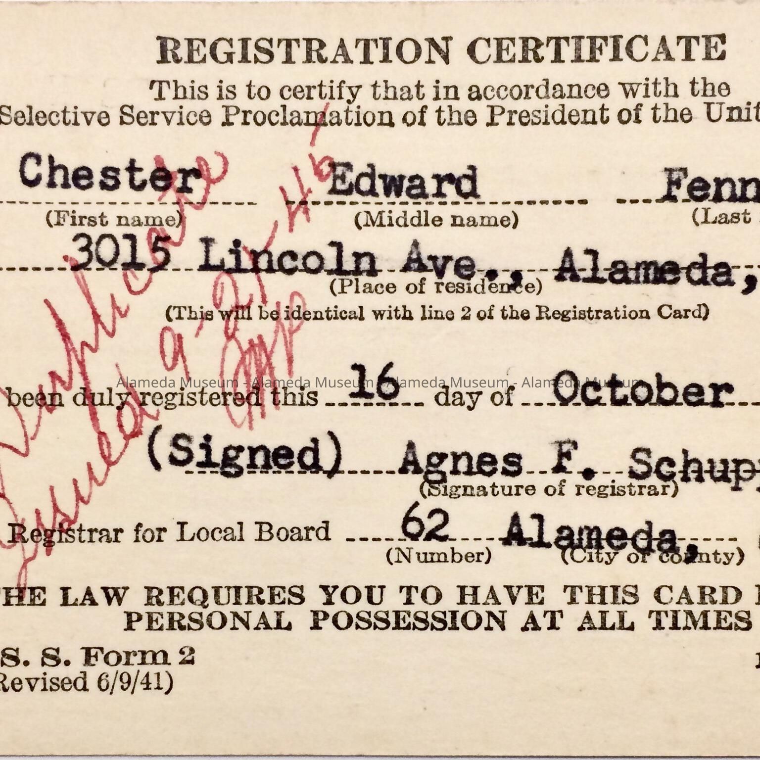 HISTORY OF OBJECT: A REGISTRATION CERTIFICATE FOR CHESTER EDWARD FENN OF 3015 LINCOLN AVENUE, ALAMEDA FOR SELECTIVE SERVICE DURING WW-II.