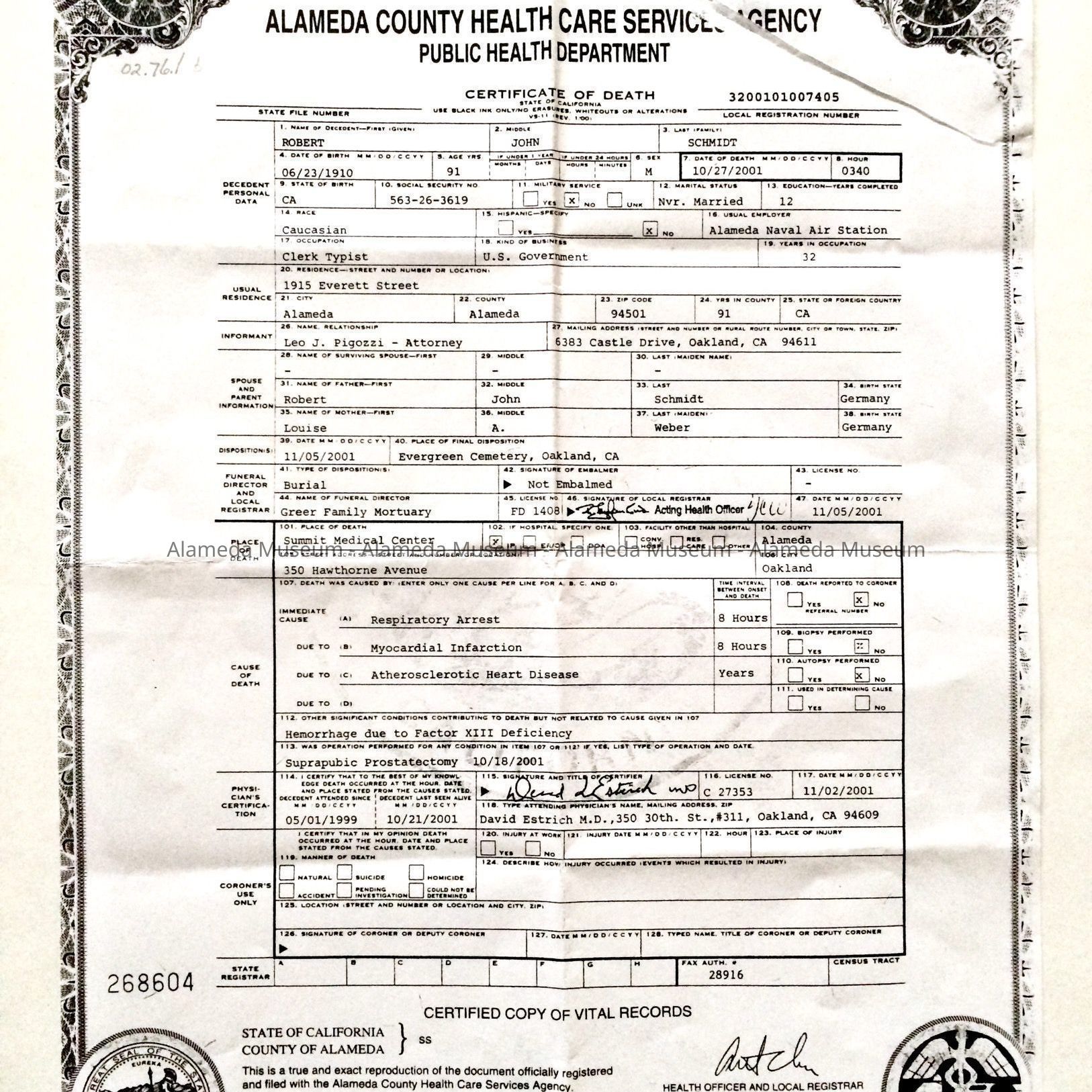 The following collection is from the late-Robert John Schmidt, Jr., born June 23, 1910, and died October 27, 2001. Mr. Schmidt was employed as a clerk typist at the Alameda Naval Air Station for many years. His parents, Robert John and Louise A. Weber Schmidt were both originally from Germany and lived in San Francisco prior to moving to Alameda. They purchased 1915 Everett Street in 1914 and farmed the lot adjoining the residence. Mr. Schmidt was a life-long resident of Alameda and attended schools here.