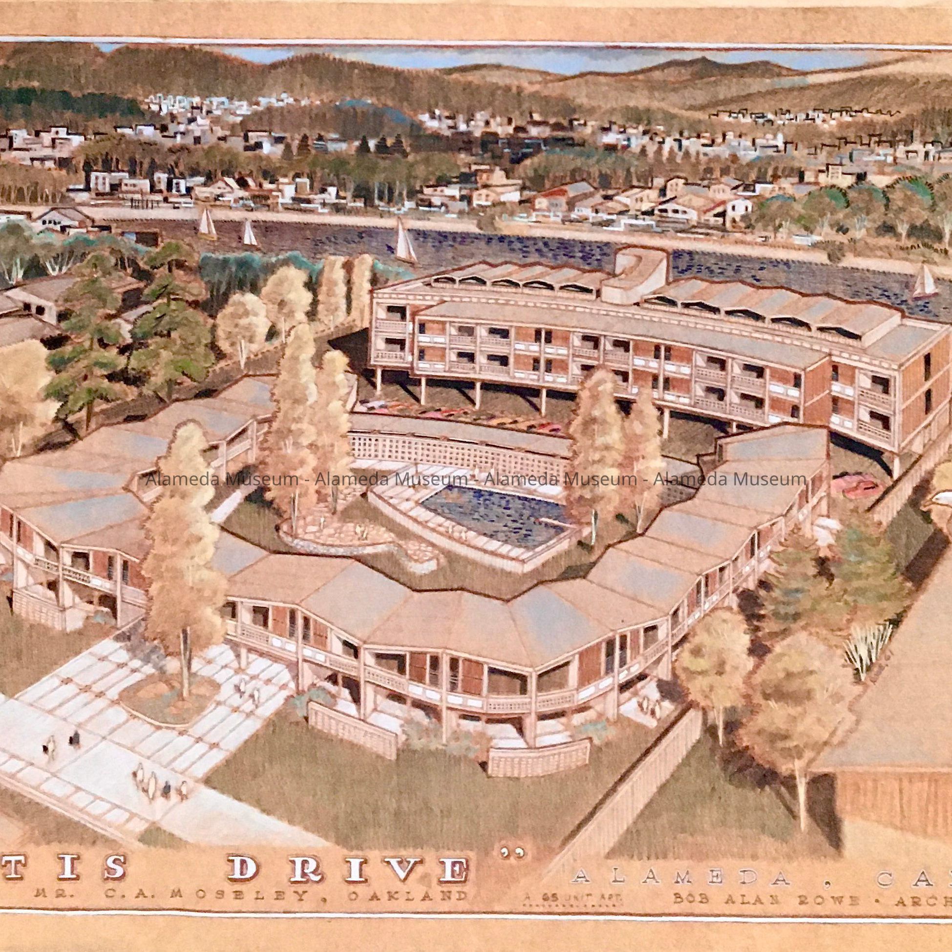 HISTORY OF OBJECT: AN ARCHITECTURAL RENDERING OF A PROPOSED APARTMENT HOUSE OF 65 UNITS , TO BE BUILT ON OTIS DRIVE FOR MR C. A. MOSELEY, OAKLAND, BY BOB ALLEN ROWE, ARCHITECT. AT THIS TIME WE DO NOT KNOW WHETHER IT WAS EVER CONSTRUCTED.