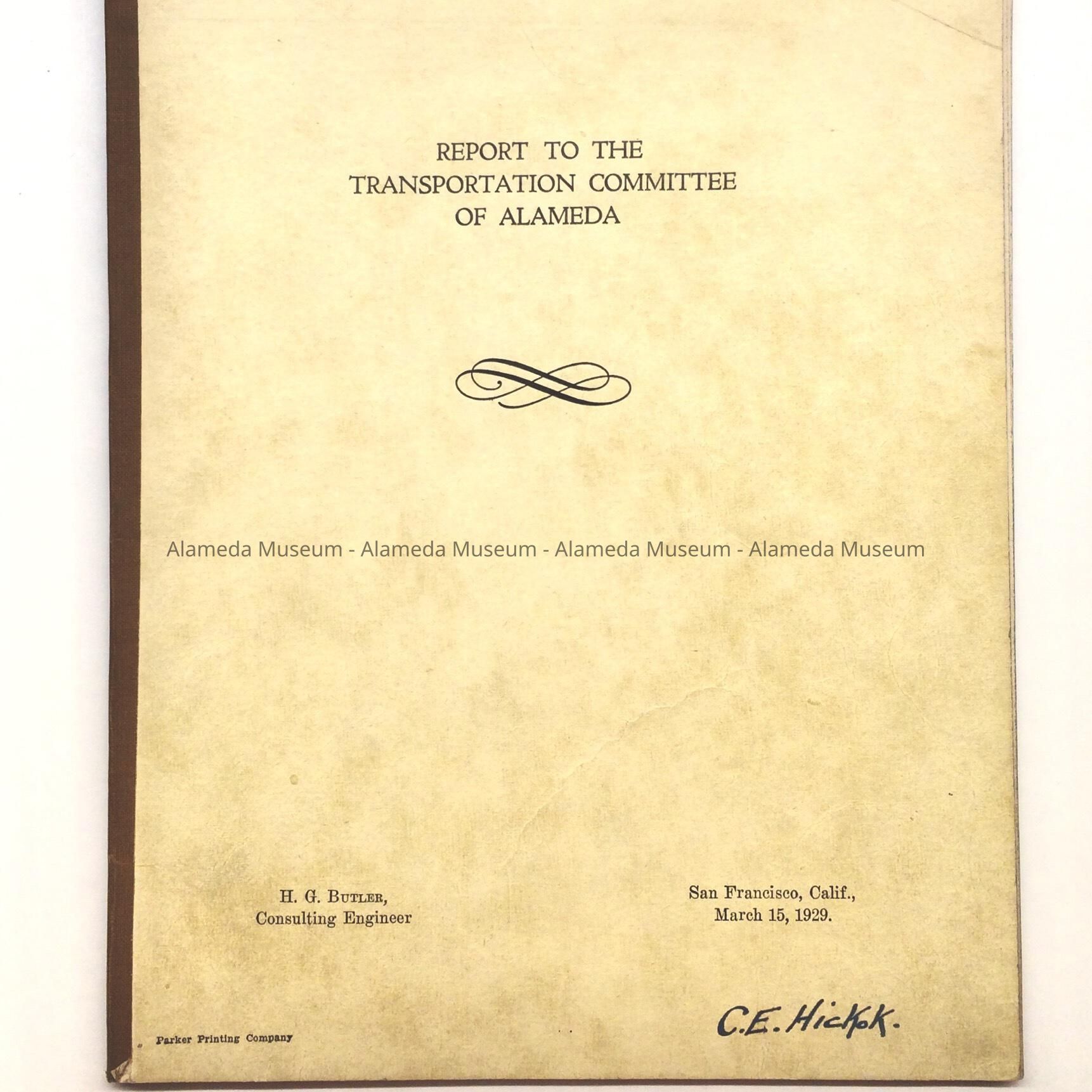 A PRINTED REPORT WITH COVER OF LIGHT BROWN-COLORED HEAVY STOCK PAPER. COVER HAS THE CAPTION, "REPORT TO THE TRANSPORTATION COMMITTEE OF ALAMEDA."