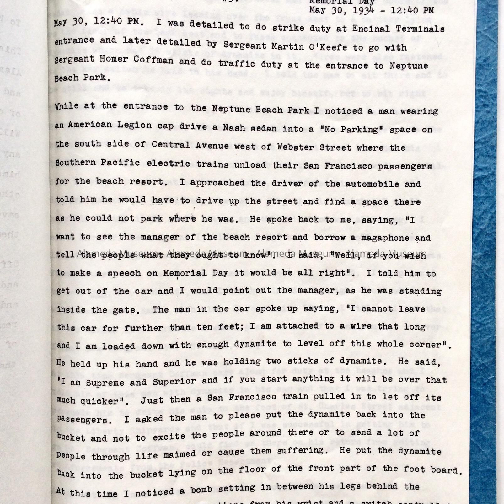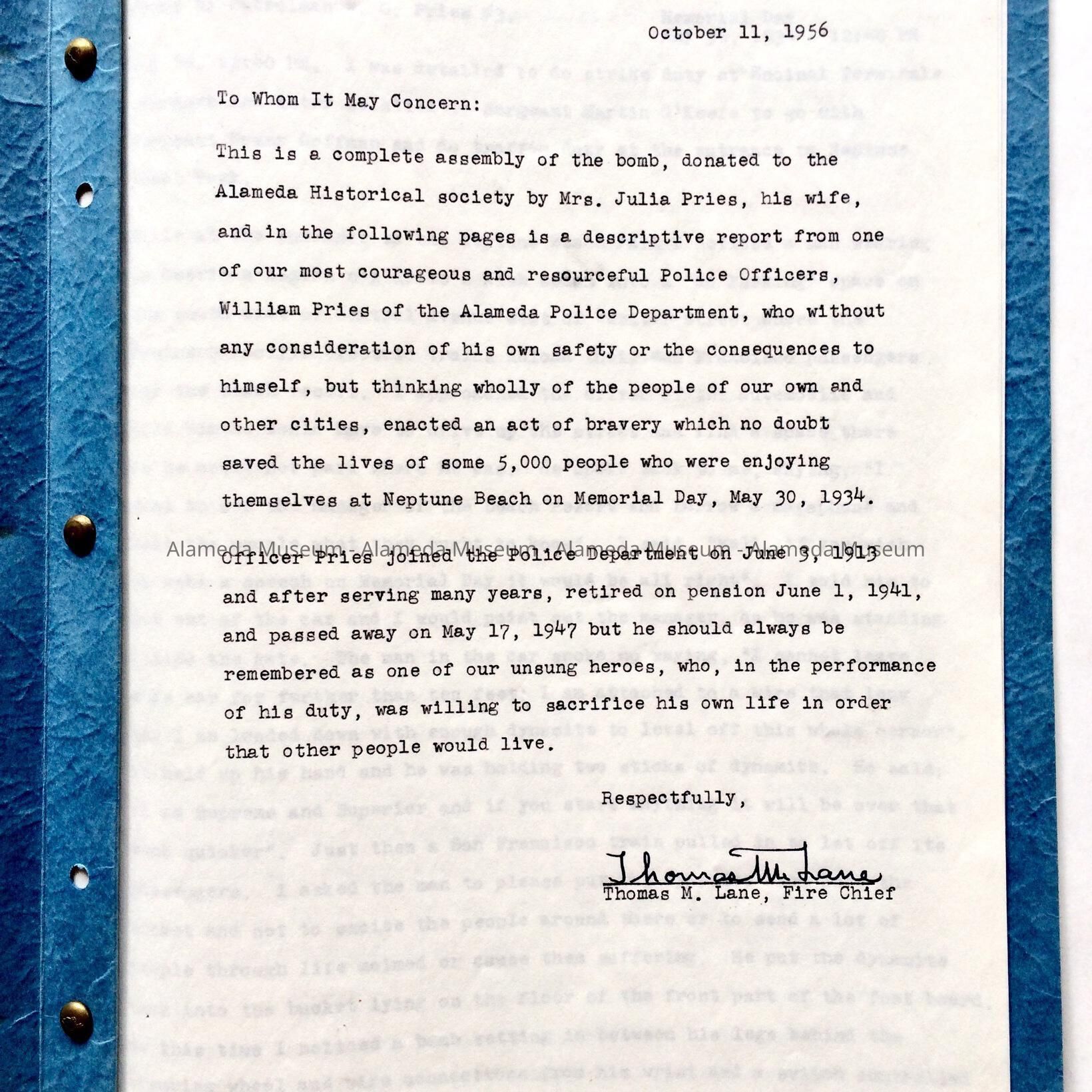 Report compiled by the late Thomas M. Lane, Fire Chief, concerning a bomb made by Frank Bennett which he intended to explode on Memorial Day, May 30, 1934 at Webster and Central Avenues and the part played by Police Officer William Pries in preventing its fulfillment.
