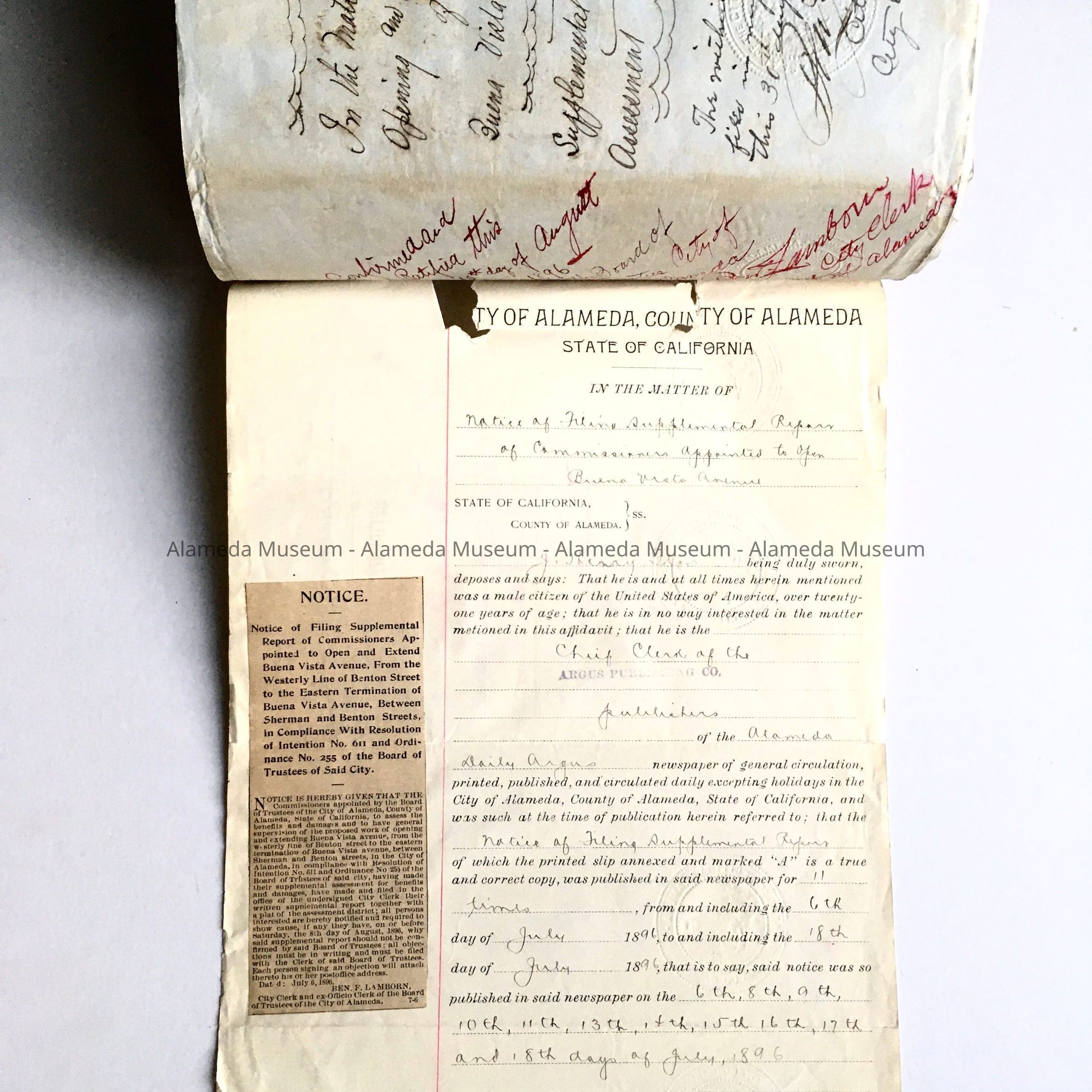 History: Report prepared by Commissioners considering opening and extending Buena Vista Avenue in the vicinity of Sherman and Benton Streets. Also includes names of property owners affected by the street opening.