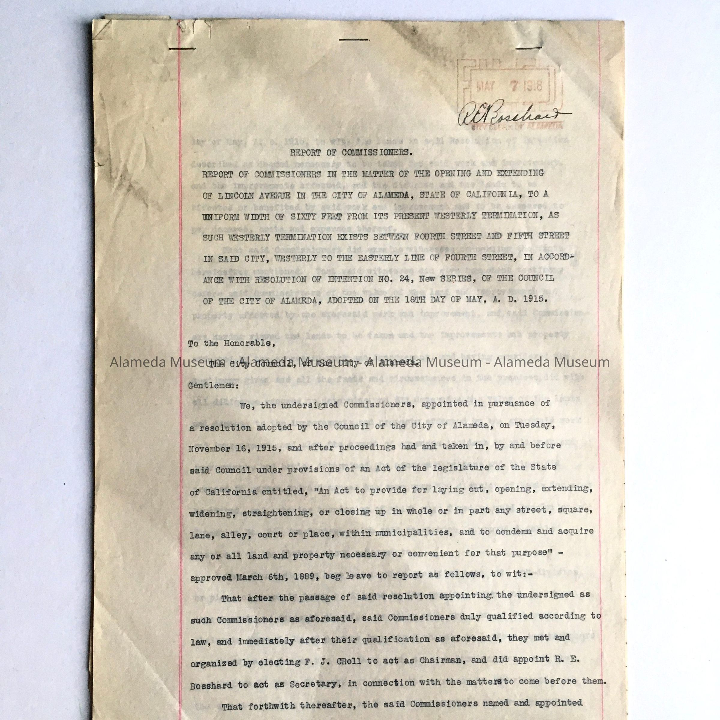 Report about opening Lincoln Ave between Fourth and Fifth Streets, 1915Entry/Object ID