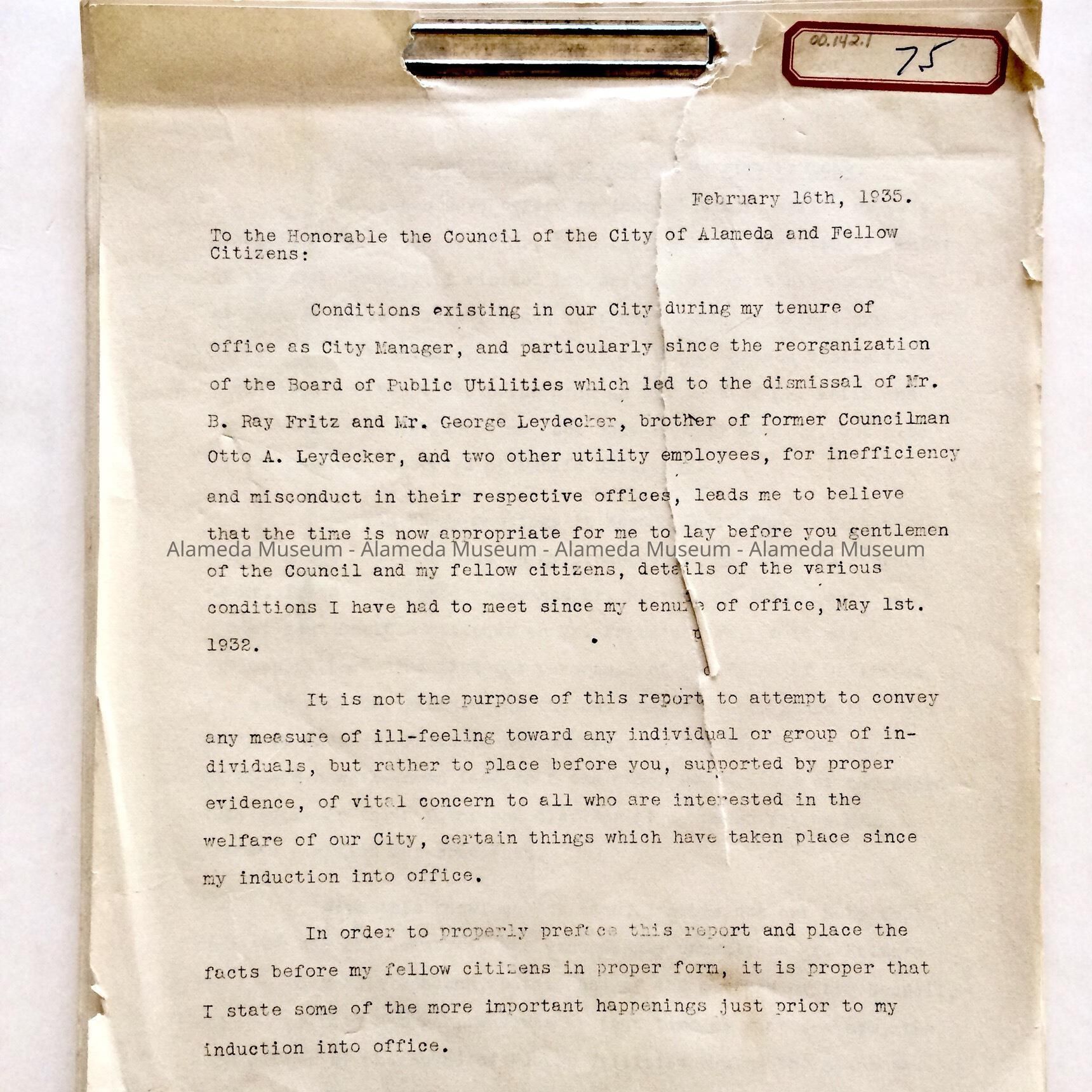 History: Report created by Ralph M. Bryant concerning political problems in City Government during the 1930's.