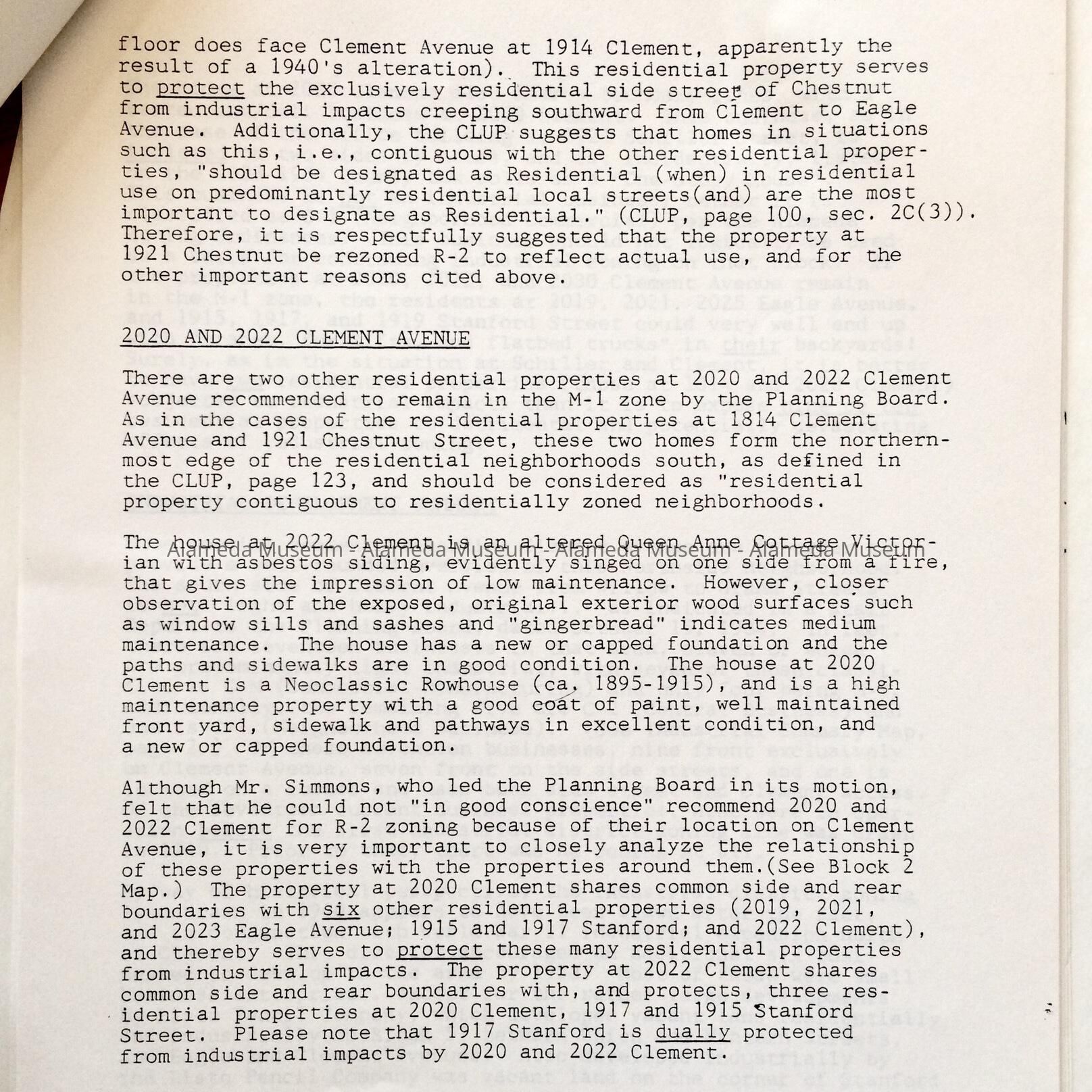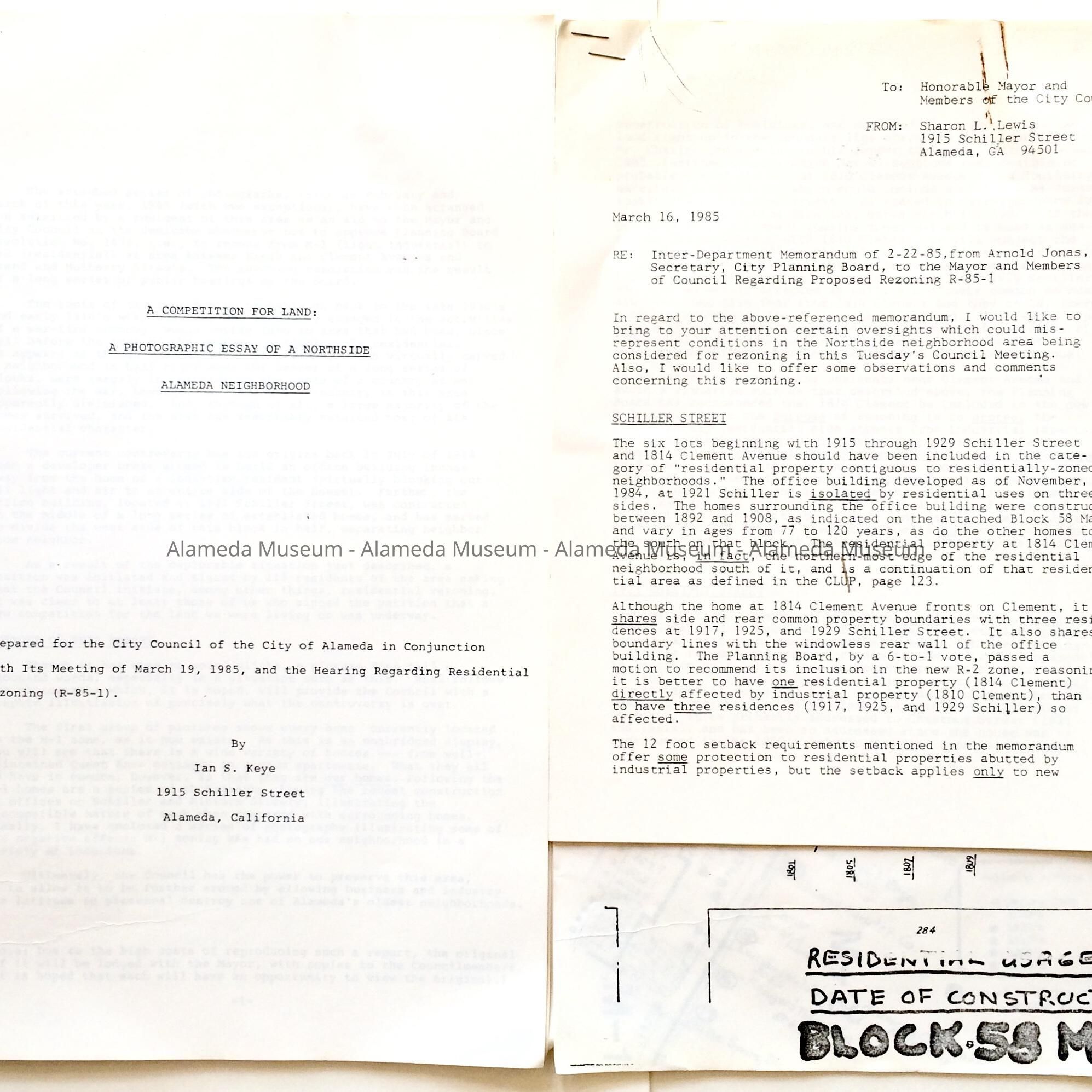 HISTORY OF OBJECT: A REPORT CONCERNING REZONING OF PROPERTY IN THE SCHILLER STREET AREA OF ALAMEDA.