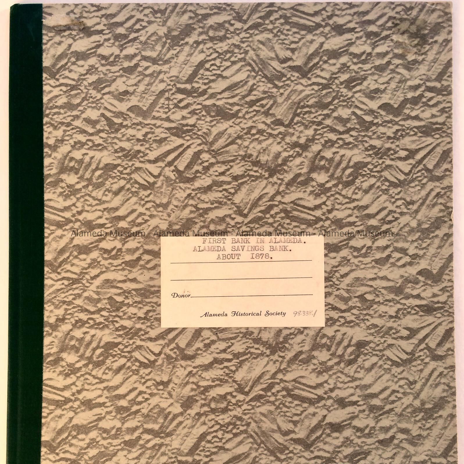 TWO-PAGE TYPEWRITTEN REPORT CONTAINED IN A PRESSBOARD COVERLET (GREEN COLOR) AND GREEN-COLORED TAPE BINDING. COVER HAS AN ATTACHED LABEL, WITH TYPEWRITTEN CAPTION, "FIRST BANK IN ALAMEDA, ALAMEDA SAVINGS BANK, 1878."