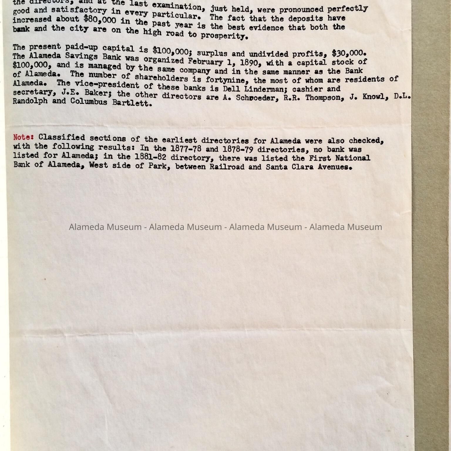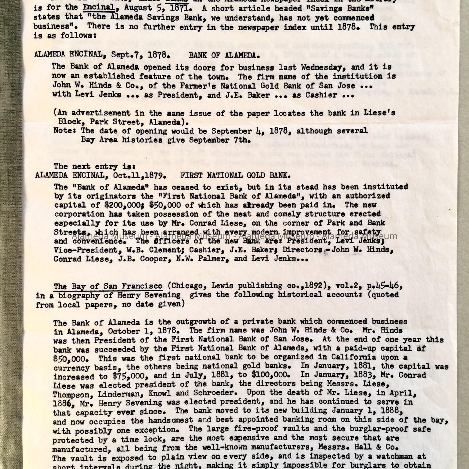 REPORT REGARDING THE FIRST BANK OF ALAMEDA, NAMED "ALAMEDA SAVINGS BANK." REPORT INCLUDES ORIGINAL SOURCES FROM THE ENCINAL NEWSPAPER, DATED 1878 AND 1879. THE BANK WAS LATER KNOWN AS THE "FIRST NATIONAL BANK OF ALAMEDA." THE REPORT WAS PRESENTED TO THE ALAMEDA HISTORICAL SOCIETY, NUMBERED "187," AND NEVER DOCUMENTED (PRIOR TO 1971).