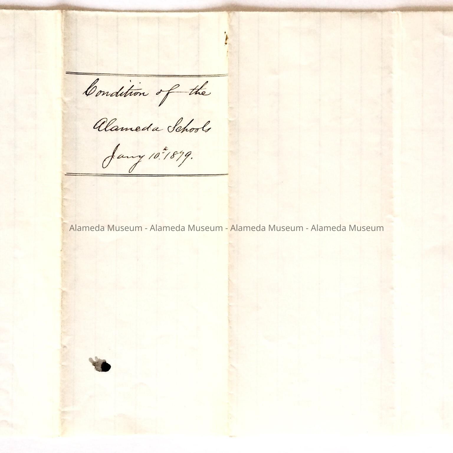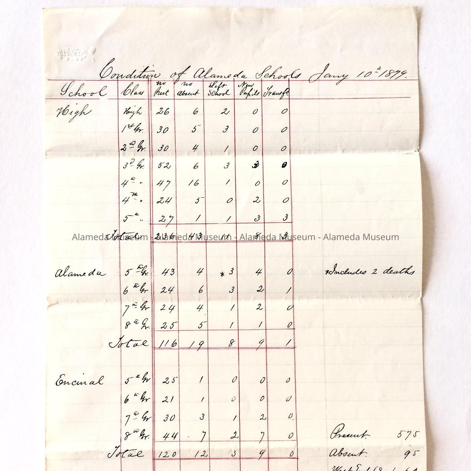 Report concerning the condition of the Alameda Schools dated January 10, 1879 setting forth class enrollment, absences, transfers, etc. of grammar through high school.