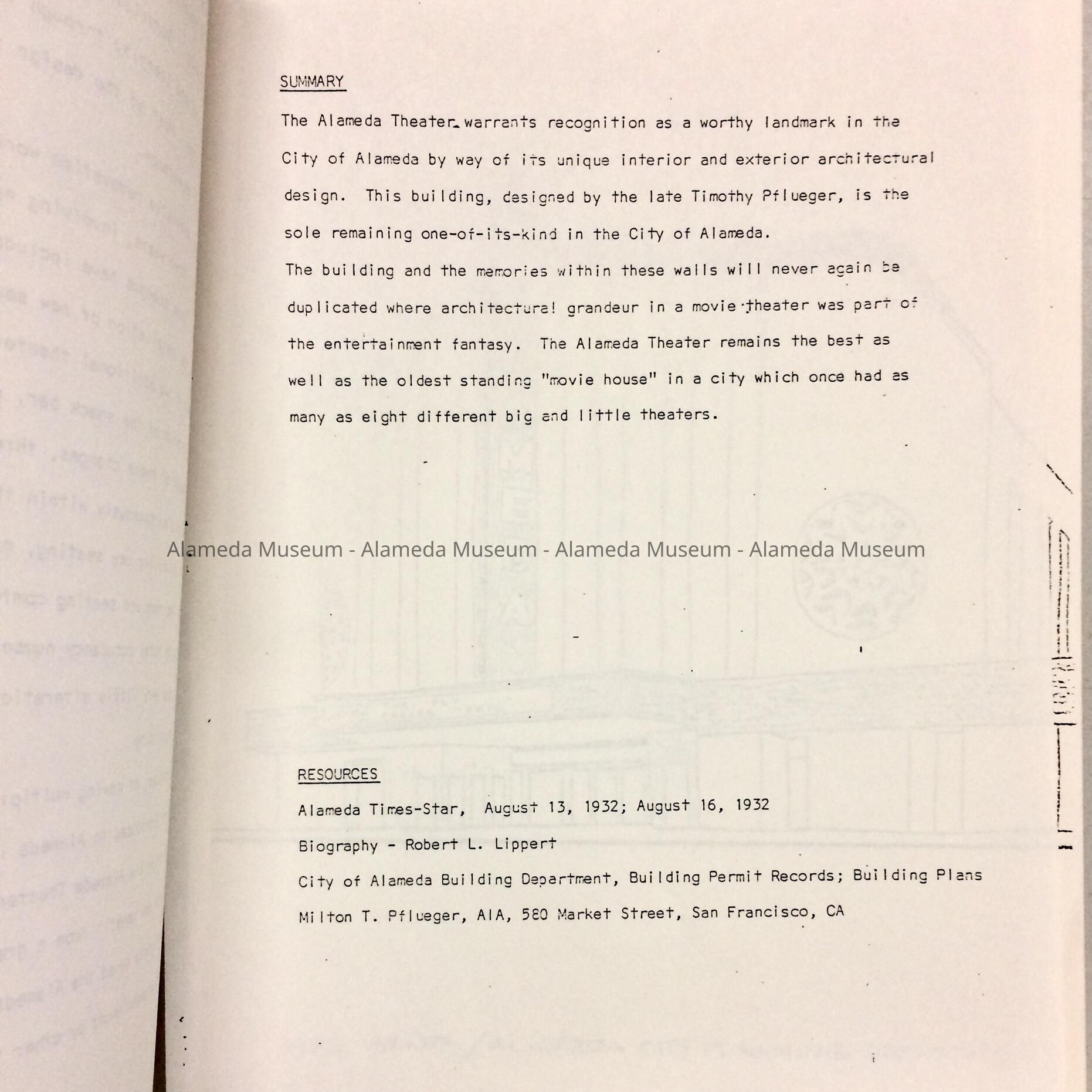 DESCRIPTION: TWO COPIES OF A MIMEOGRAPHED REPORT. COVER PAGE HAS LINE DRAWING OF THEATRE FACADE AND BOLD-PRINTED CAPTION, "ALAMEDA THEATRE," ON WHITE-COLORED PAPER.