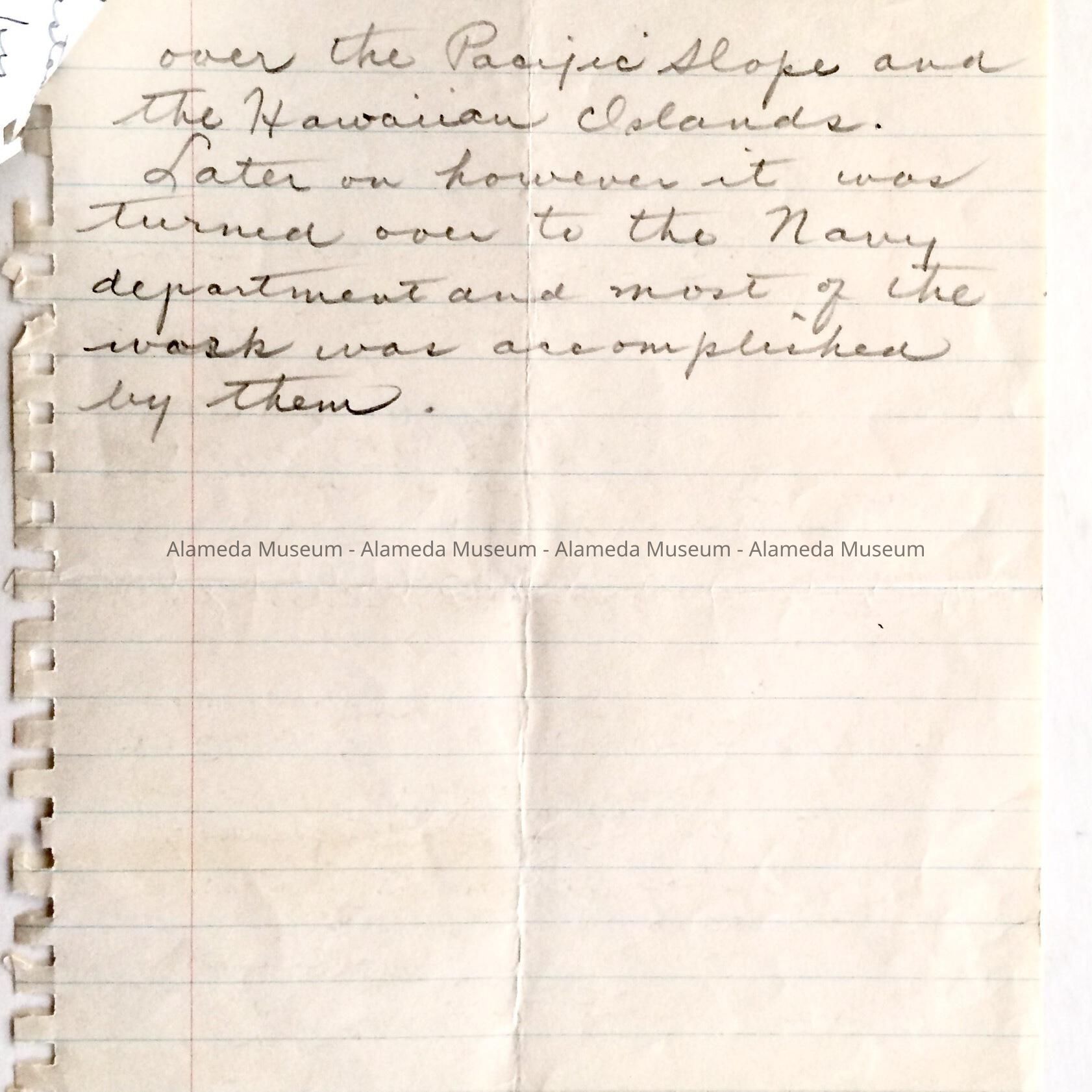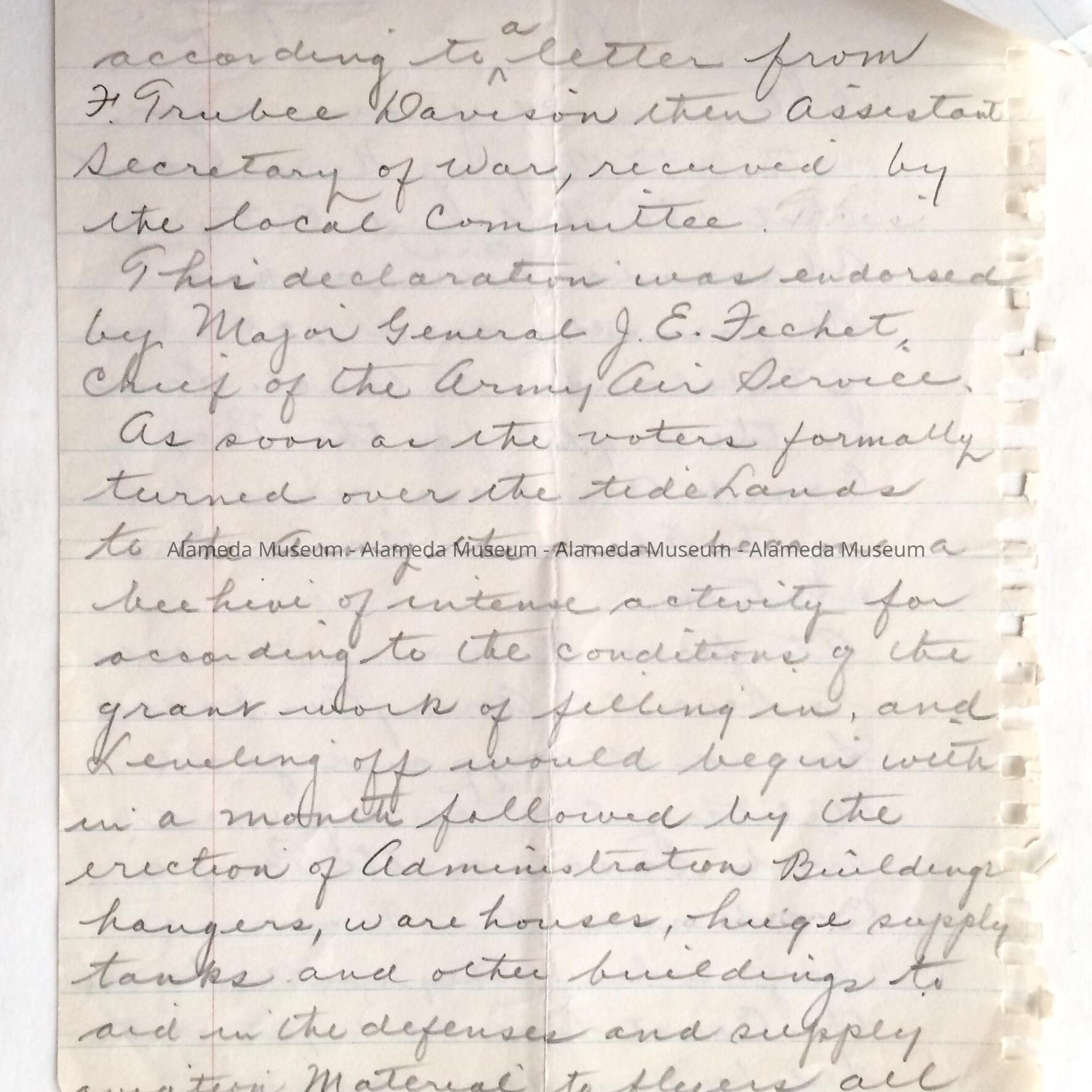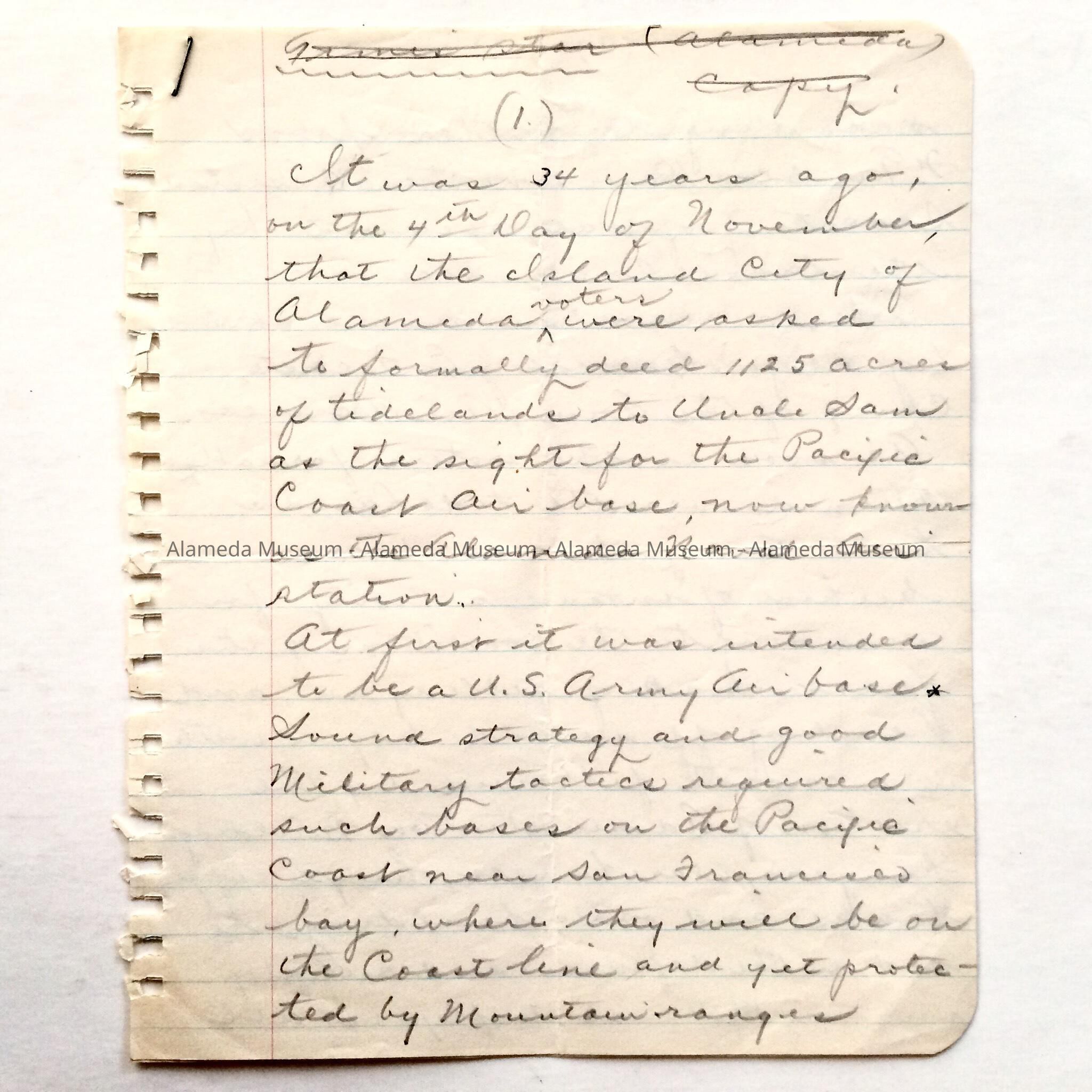 History: Two (2) page hand written report, by unknown author, concerning the history of the Alameda Naval Air Station.