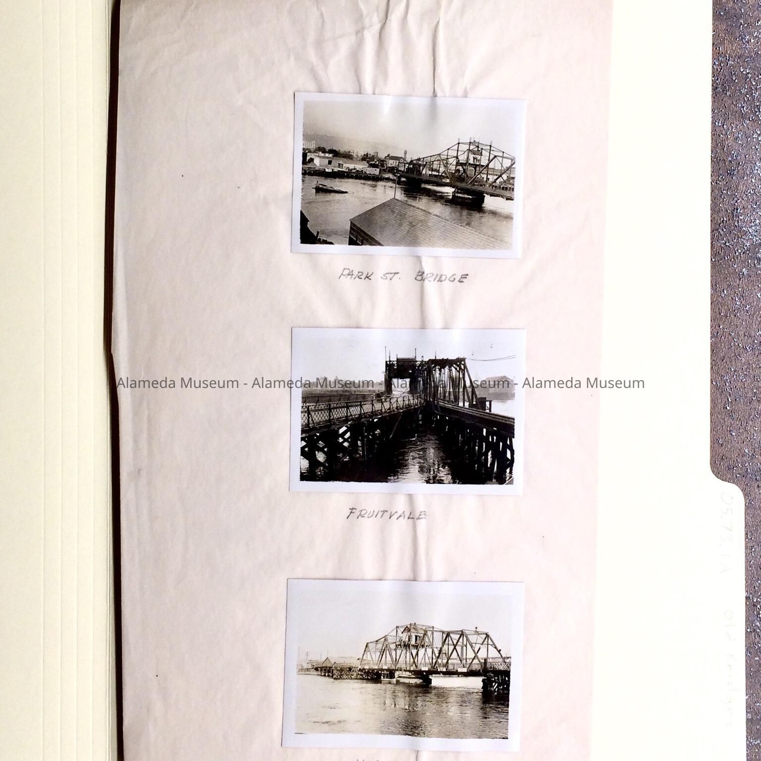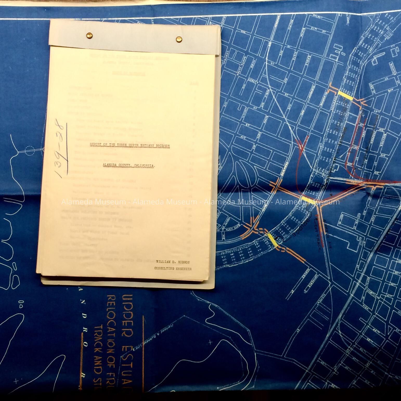 HISTORY OF OBJECTS: REPORT PREPARED BY WILLIAM D HUDSON, CONSULTING ENGINEER FOR ALAMEDA COUNTY, CONCERNING THE THREE BRIDGES THAT SPAN THE ESTUARY --- PARK STREET, FRUITVALE, AND HIGH STREET. REPORT ALSO INCLUDES INDEX, TRAFFIC INFORMATION, AND OTHER DETAILS.